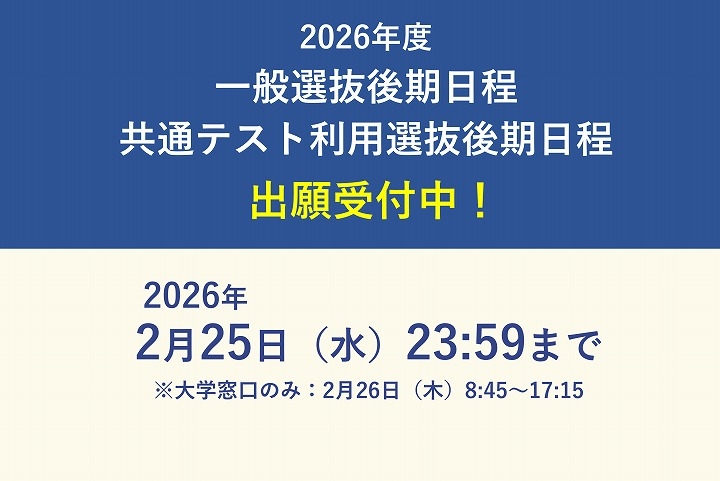 一般選抜後期、共通テスト利用選抜後期日程 出願期間(2月13日(金)9:00~2月25日(水)23:59)