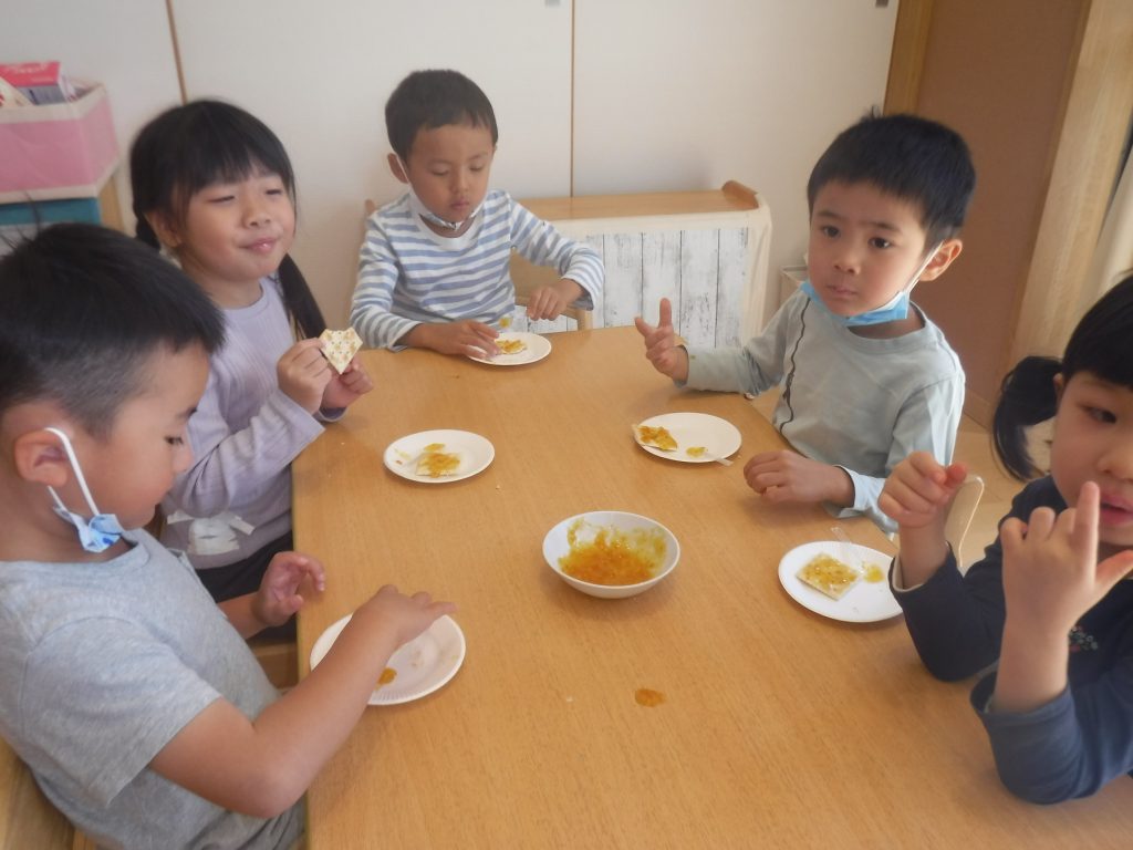 出来上がった橘ジャムは甘酸っぱいとってもおいしいジャムになりました。みんなでクラッカーに橘ジャムを乗せて食べました。「あまくなってる」「おいしい!!」とニコニコ笑顔で何個もおかわりして食べていました。