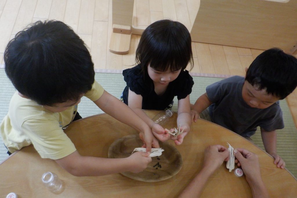 ボトルに小さい種を入れて、シールを貼ると、いい音が鳴る