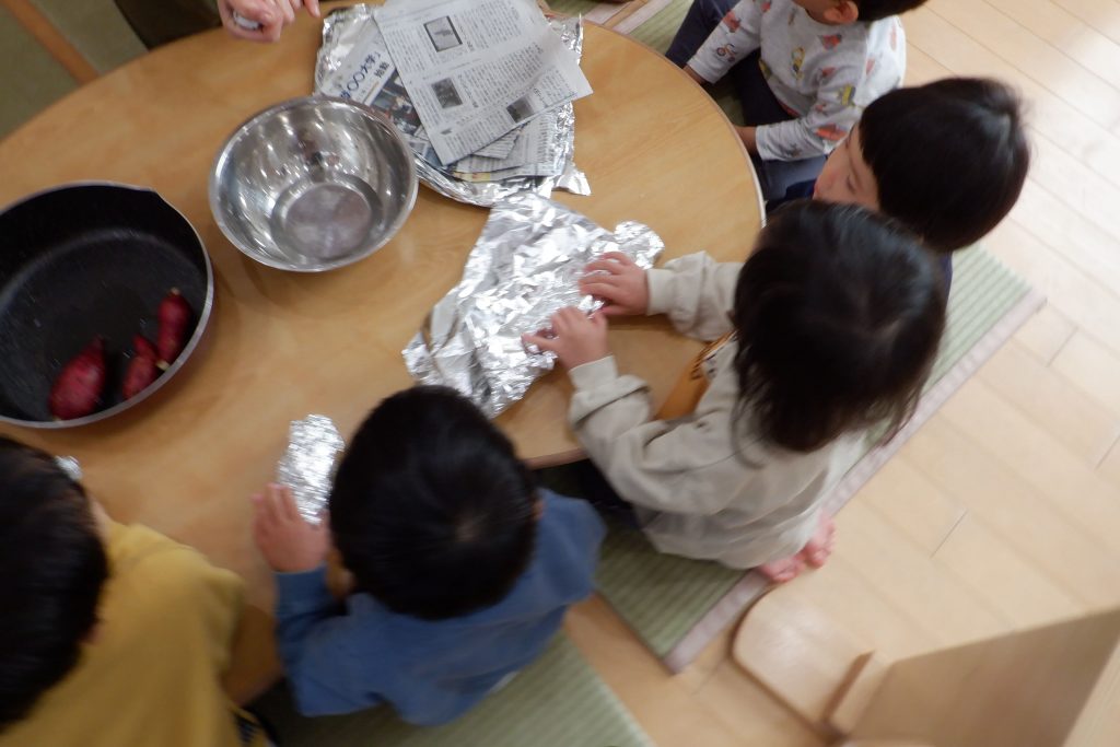 みんなで掘ったサツマイモに、濡らした新聞紙とアルミホイルを丁寧にまきました。