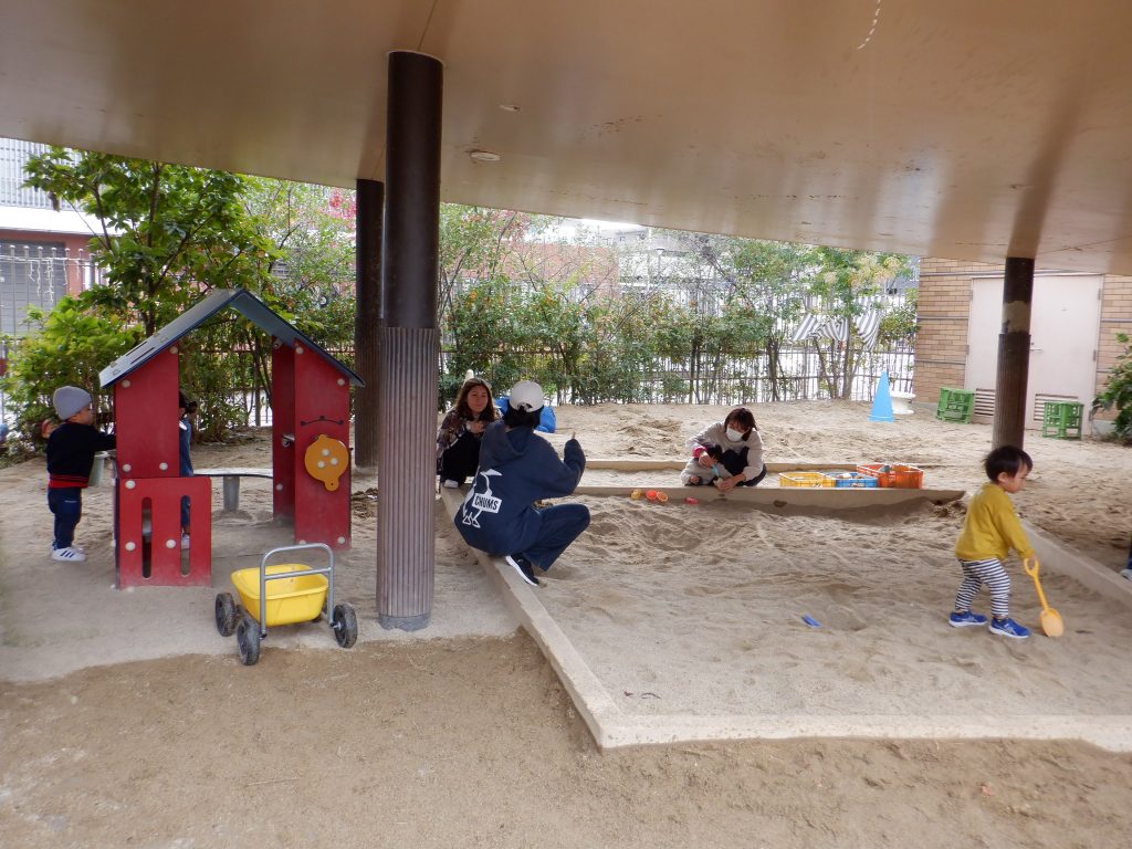 途中雨が降りましたがスロープ下へ避難し、雨が上がるとまたフープや4輪バイクに乗って楽しそうに遊んでいました。
