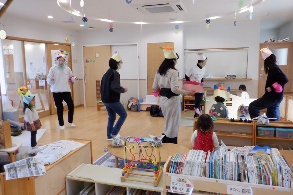 お面作りの後は、みんなでお面を付けて『鬼のパンツ』を楽しく踊りましたよ。