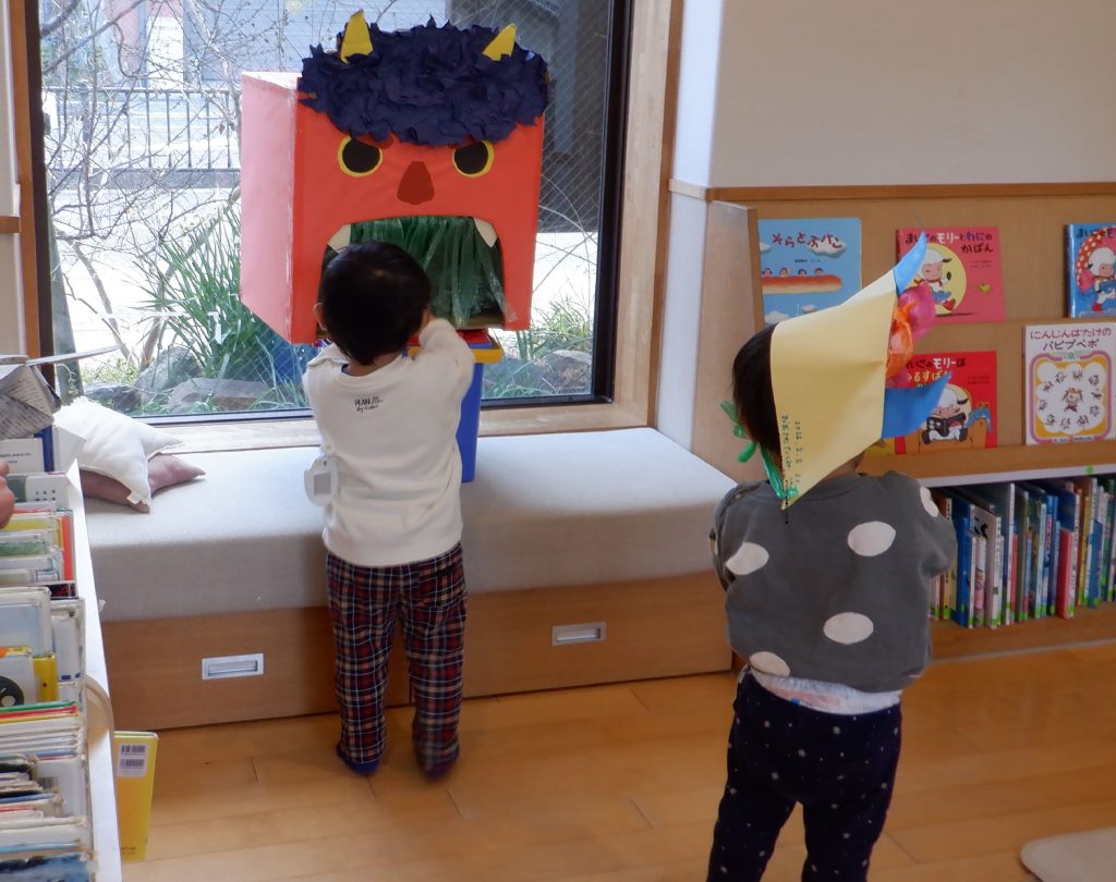 大きな鬼は少し怖かったようですが、お母さんと一緒に投げることができました。