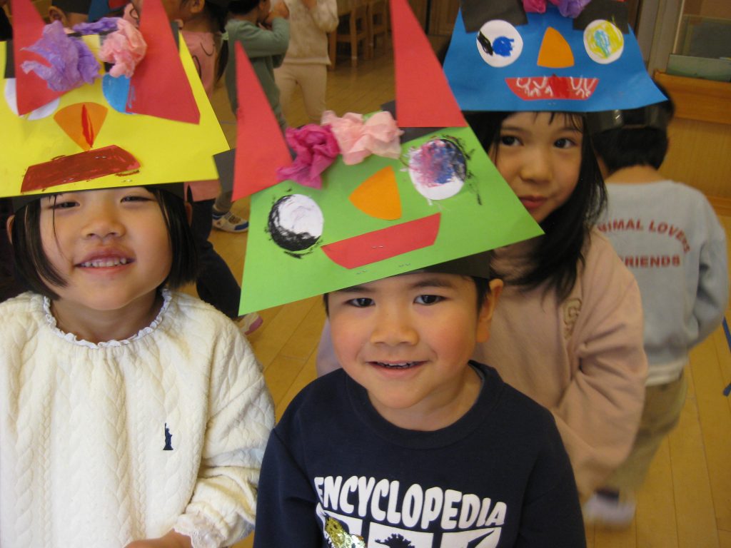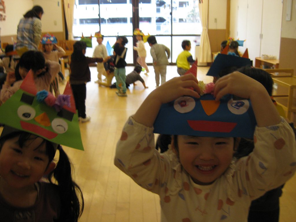 2歳児ののはな組の子どもたち、3歳児にじ組・おひさま組の子どもたちは、自分たちで作ったかわいい鬼のお面をつけて豆まきを楽しみました。それぞれの鬼のお面は何となく自分の顔に似ているようで、かわいい鬼さんです。