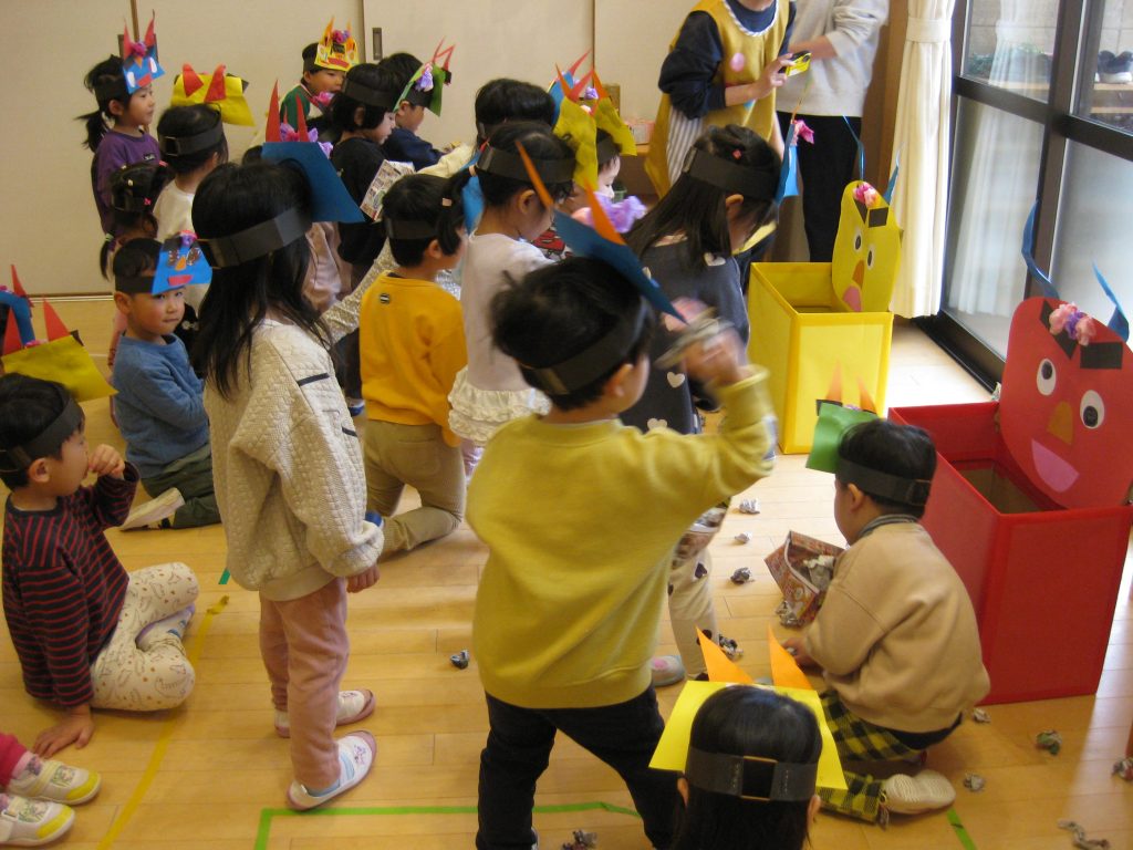 「自分の心の中にいる、泣き虫鬼・怒りんぼ鬼・好き嫌い鬼をやっつけよう」「でも優しい鬼さんもいるんだよ」と先生のお話を聞いたり、お友だちと一緒に鬼の的をめがけて、新聞紙の豆を投げたりしていました。