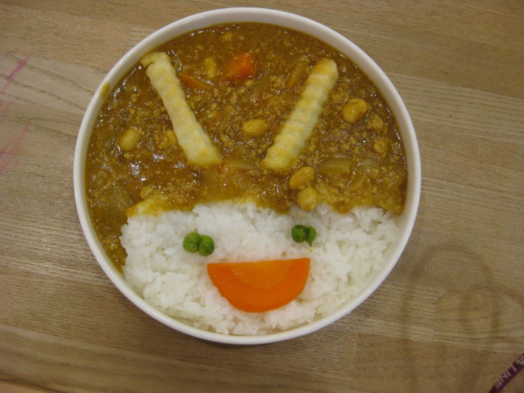 給食は毎年恒例の“鬼カレーです。”子どもたちの大好きなメニューで、自分でカレーにポテトと人参・グリンピースをトッピングして、“鬼の顔”を完成させます。