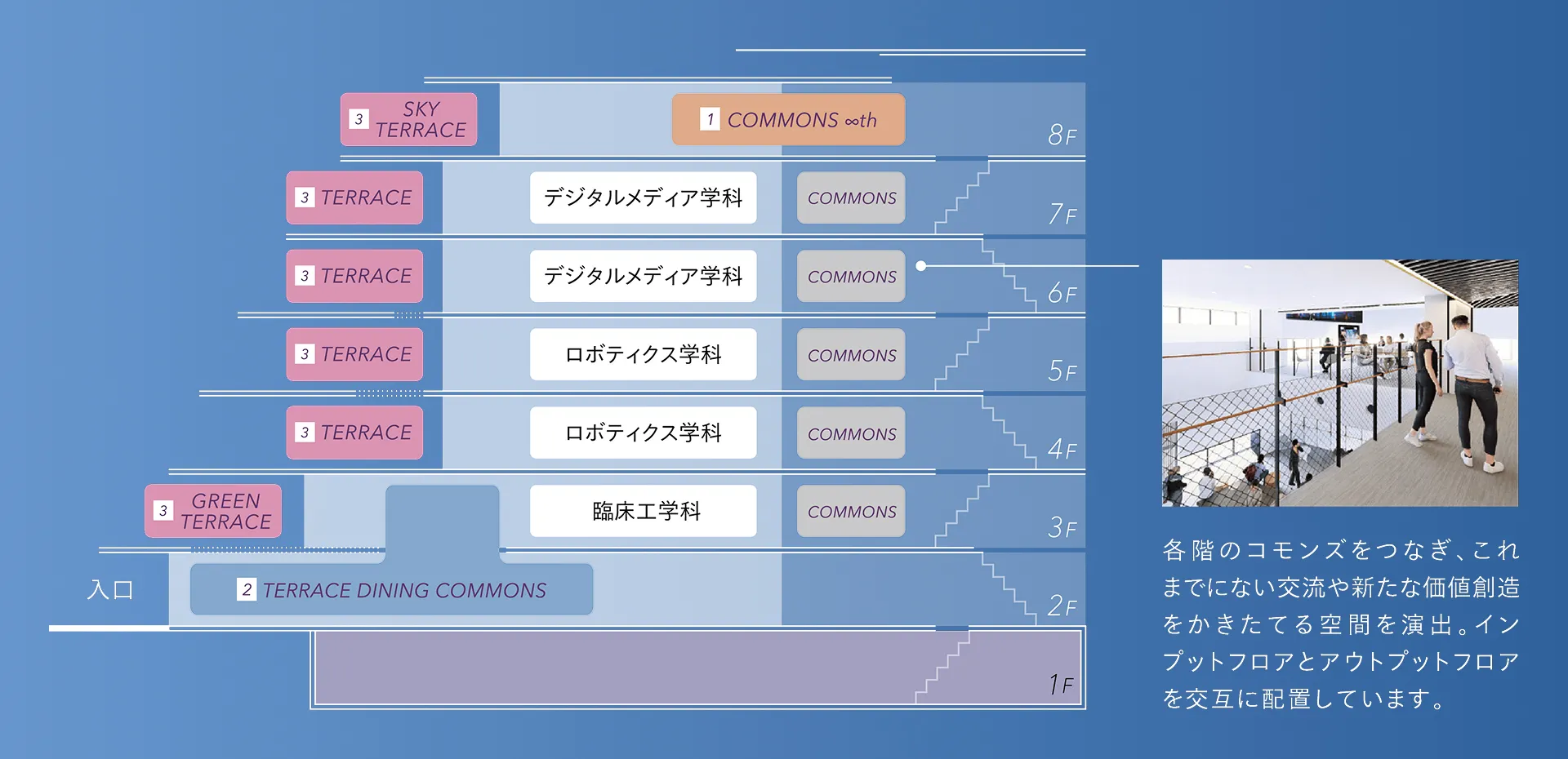 施設内は、新学科の学びに活用される教室や設備に加え、各階に学生同士の集いの場として「コモンズ」を配置。学問分野を越えた相互関係が生み出され、新たな交流や価値創造をもたらします。