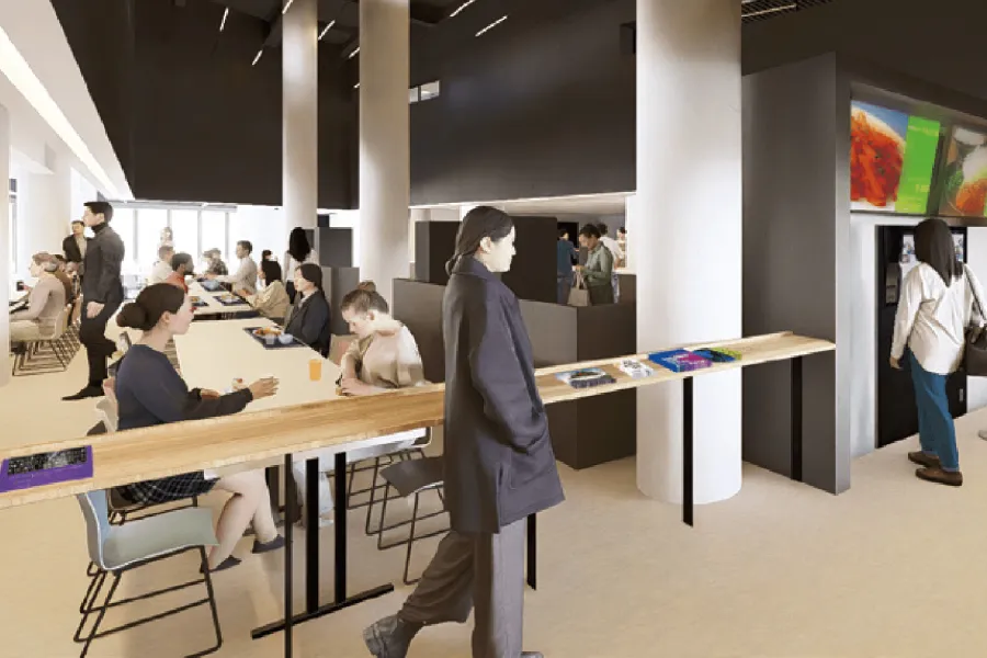 6つの店舗が並ぶフードコートスタイルでモバイルオーダーを導入。食堂としての機能はもちろん、可変性をもった大空間でいつまでも滞在したくなる居場所です。