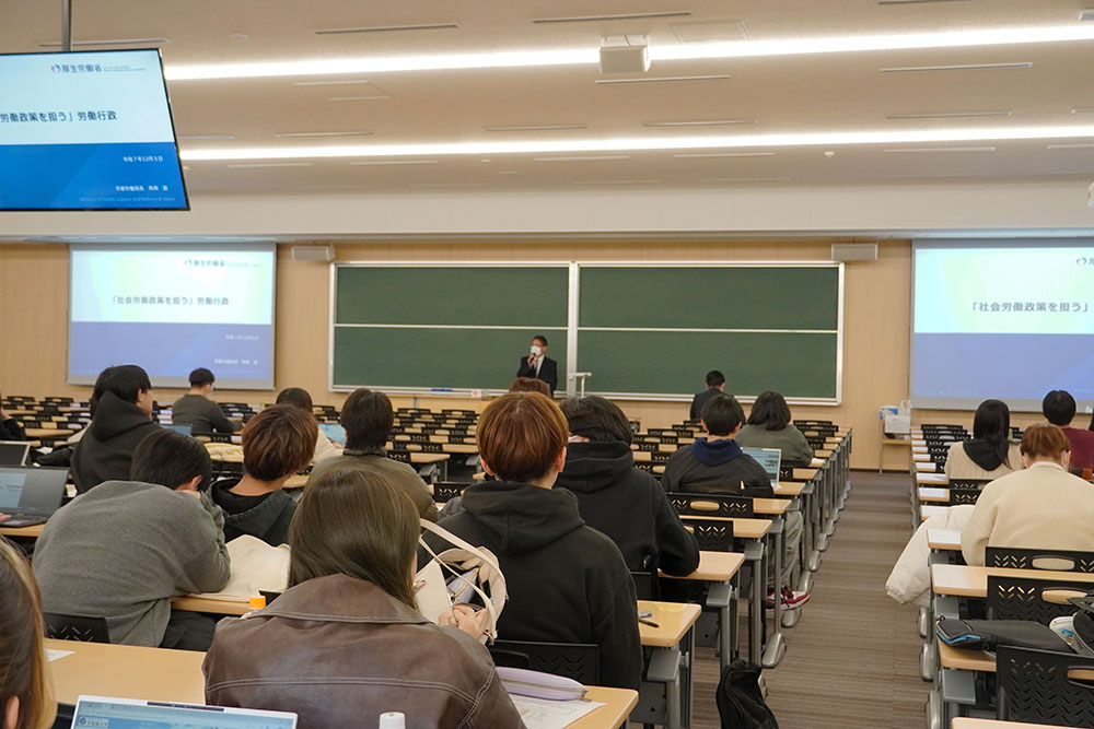 労働基準法などの法令に基づき、労働条件の確保や働く人の安全・健康を守ることを任務とする労働基準監督官の職務と役割についてご講演いただきました。また、現代の労働問題の実態について、精神障害事案の急増やドライバーの過重労働など、データに基づき現状の分析をお伺いすることができました。学生にとって身近な「労働トラブルへの対応策」に関するお話では、受講学生が自分事として真剣に耳を傾ける様子が見られました。