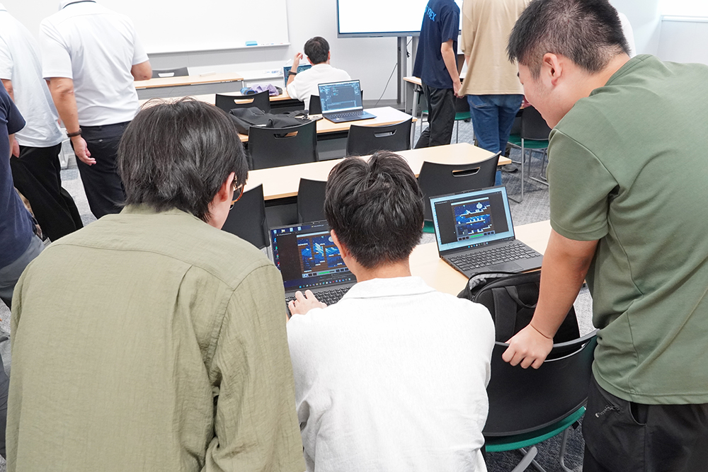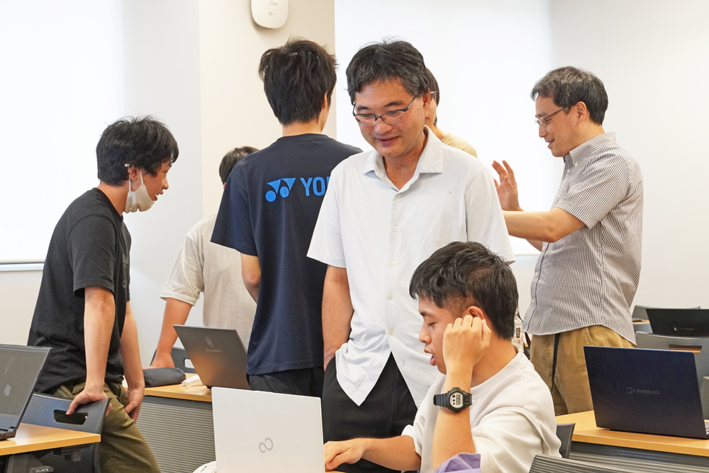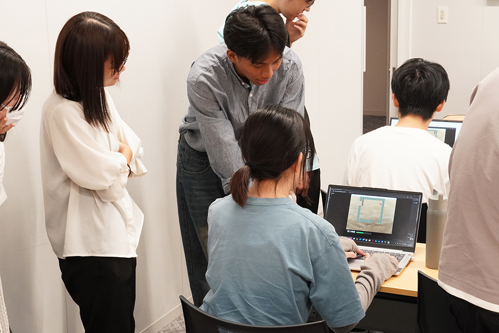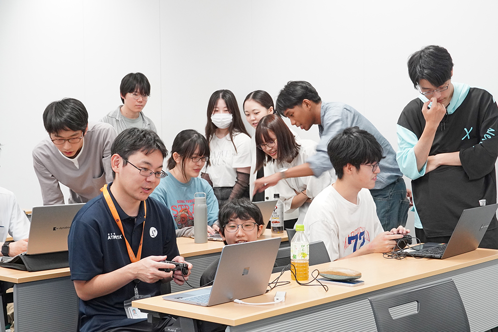 各発表が終了後、参加した聴講者を交えてゲームを体験する時間が設けられ、制作した学生たちの説明を聞きながら聴講者もゲームに挑戦しました。実際にゲームを操作することで、制作した学生とそのゲームを体験するプレイヤーが活発に意見交換し、ゲーム制作の難しさと楽しさを実感する機会となりました。