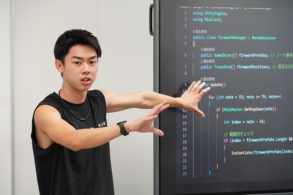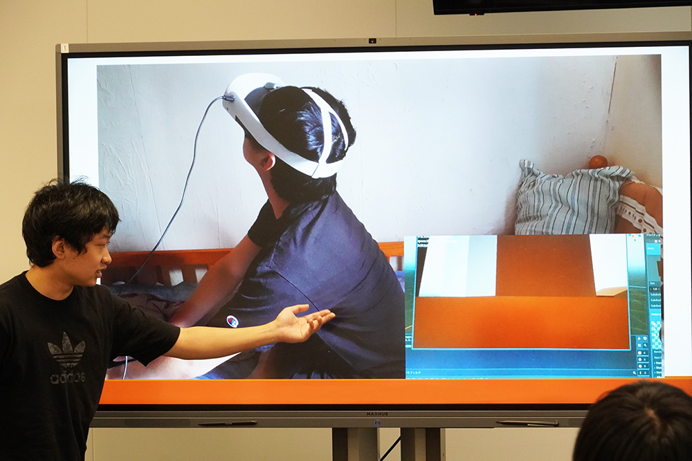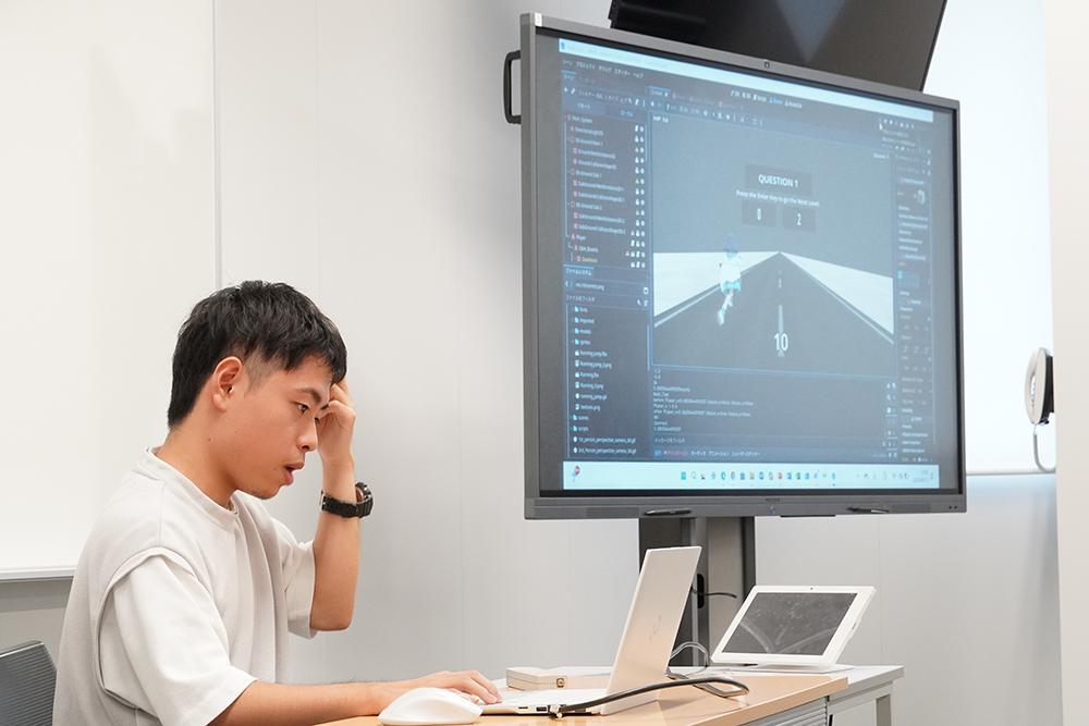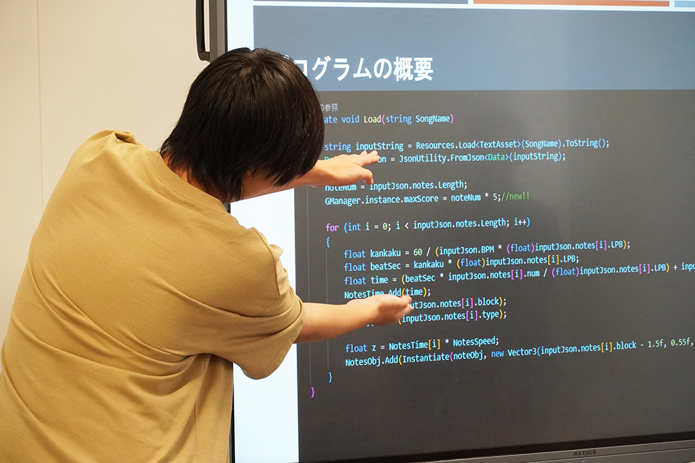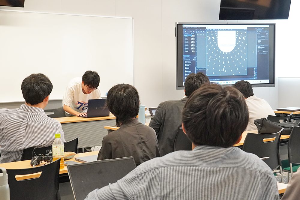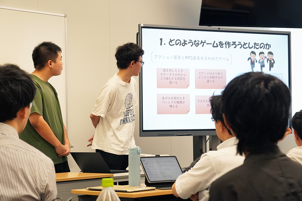 公開授業として実施された成果報告会では、個人またはグループからゲームの概要、キャラクター設定、操作方法、制作に際し苦労した点などが発表されました。学生たちが制作したゲームは、弾幕シューティングゲーム、音楽に合わせて操作するインタラクティブゲーム、VRゲームやRPGなど多種多様で、それぞれの特色が表れた発表となりました。