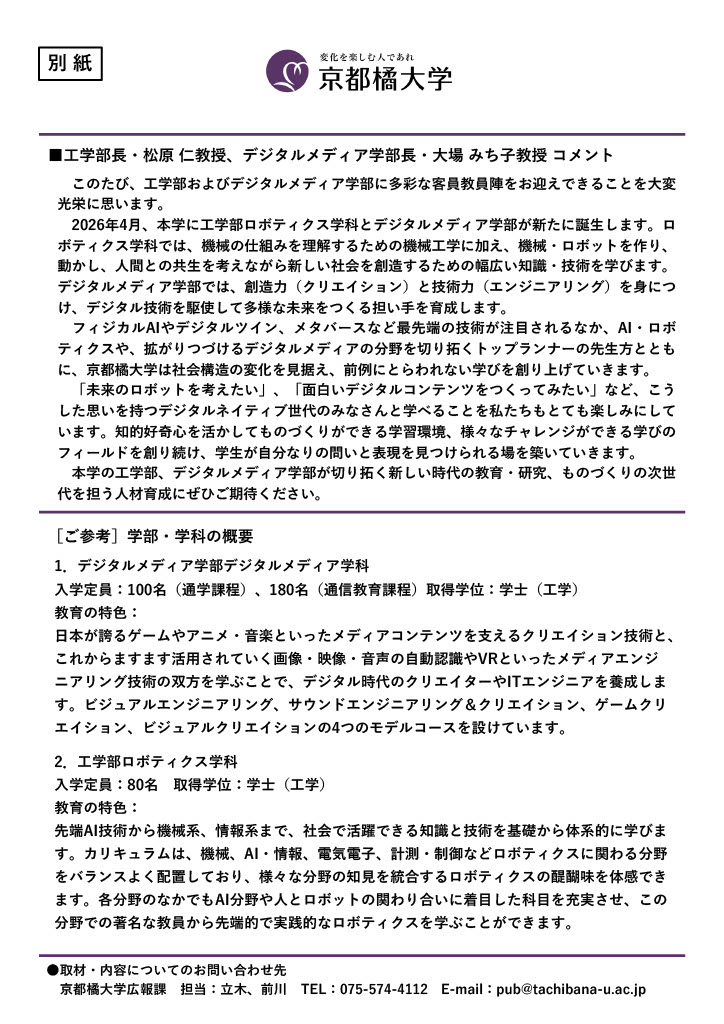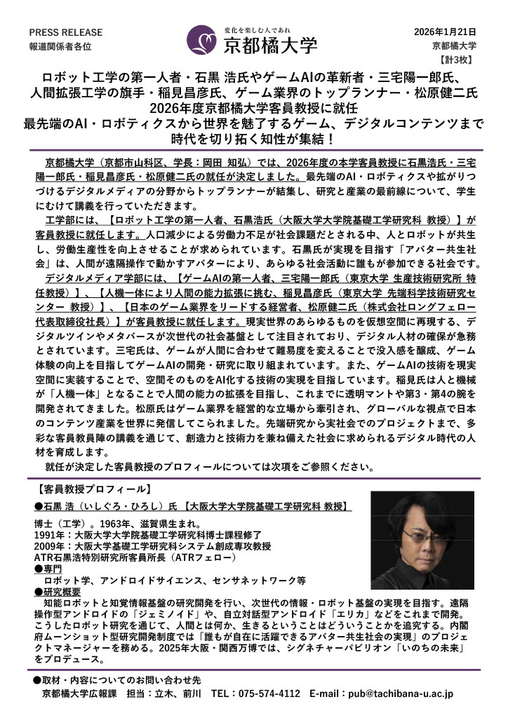 ロボット工学の第一人者・石黒 浩氏やゲームAIの革新者・三宅陽一郎氏、人間拡張工学の旗手・稲見昌彦氏、ゲーム業界のトップランナー・松原健二氏2026年度京都橘大学客員教授に就任