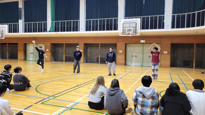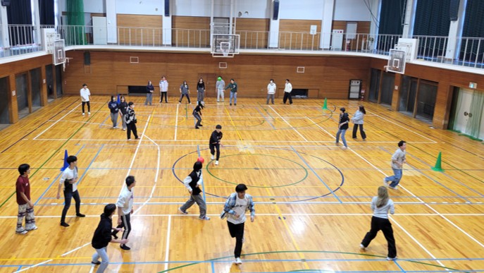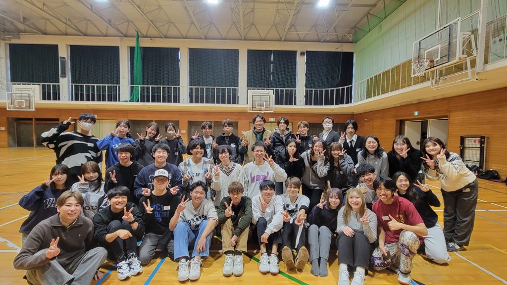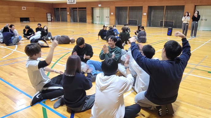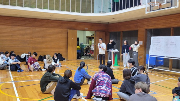 当日は1~4回生の学生38名が参加し、ドッジボール、曲混ぜゲーム、英語を使ったジェスチャーゲームなど、学年や所属コースに関係なく楽しめる活動を行いました。会場は終始笑顔に包まれ、積極的な交流が生まれました。特に、英語を使ったレクリエーションでは、LAの学生たちが日頃の経験を生かして進行を工夫し、英語が苦手な学生も楽しめる時間となりました。