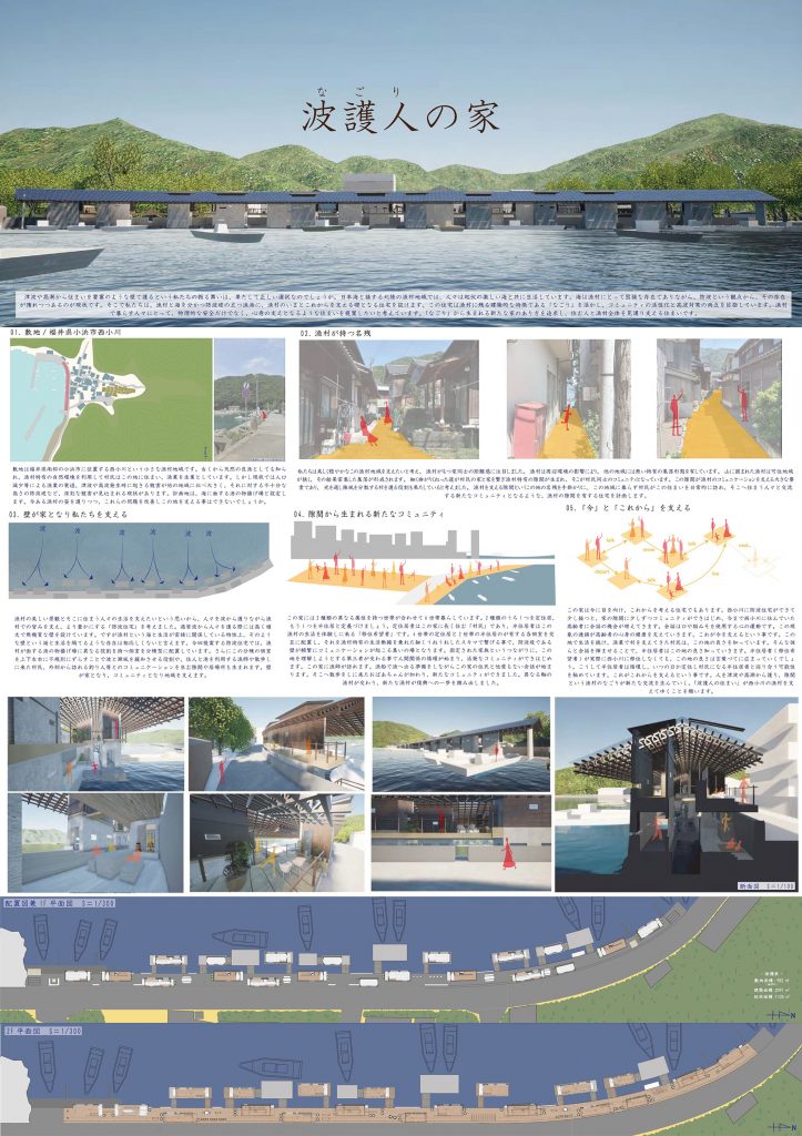作品名にある「波護人(なごり)」はメンバーが独自に考案した言葉です。漁村に残る建築的な特徴=なごりを活かし、コミュニティの活性化と高波対策を両立しつつ、住む人と漁村全体を見護り支える住まいをコンセプトに設計。審査員からは、非常にセンセーショナルなパースが前に出ている点、また東日本大震災の際に度々社会的な話題となった、津波対策すなわち堤防を作ることがよいのかということを正面で捉えようとしている点が評価され、受賞につながりました。