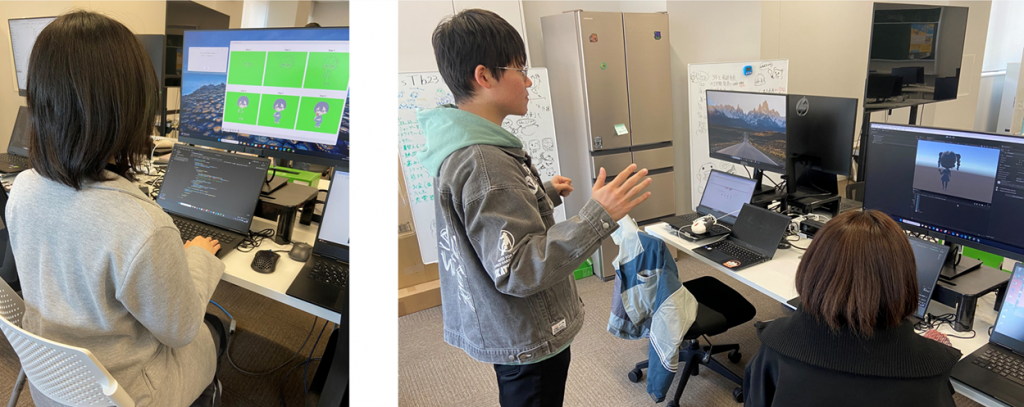 1本目の論文の筆頭著者である松本さんは絵が得意で、自身が制作した多数のイラストを用い、作画の過程をAIに学習させる研究を担当しています。AI内部で画像の特徴量を推定し、その特徴量をもとに次の段階の絵を予測させる試みを行っています。