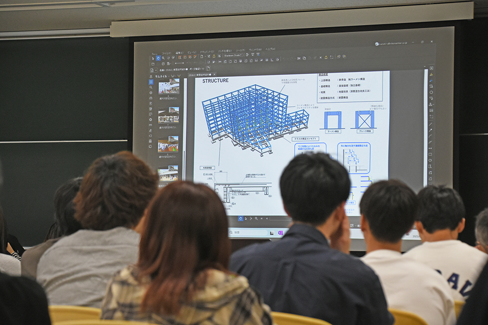 さらに、建築施工を学ぶ3・4回生に対しては、設計・監理を担当している日本設計の鈴木主管と小早川主管から、ACADEMIC TERRACEの空間設計と構造設計に関する基本的な解説もあり、学生たちは空間づくりの全体像をより深くする機会となりました。