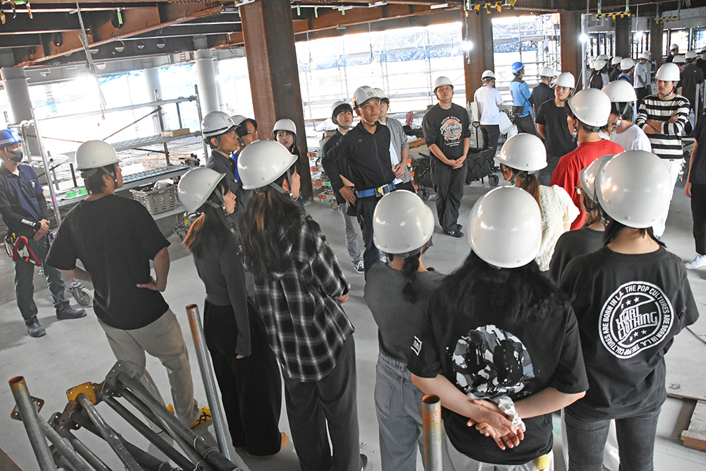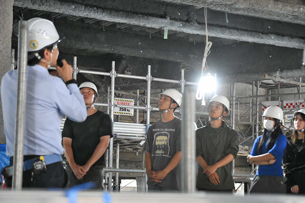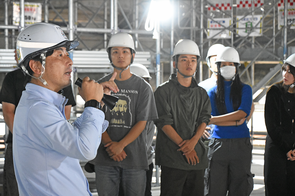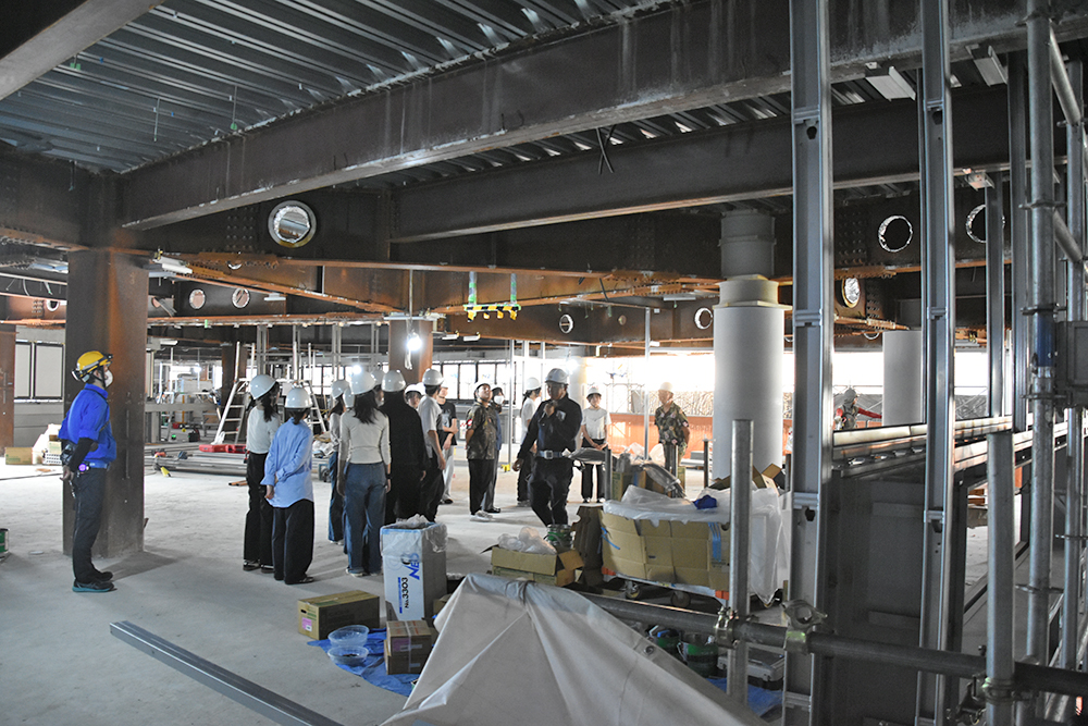これらの事前学習を踏まえたうえで、学生たちは現場ツアーに臨み、現場の構造を間近に見ながら、使用されている建材・工法の確認、施工管理の工夫など、教室では得られないリアルな学びを通じて建築への理解を深めました。