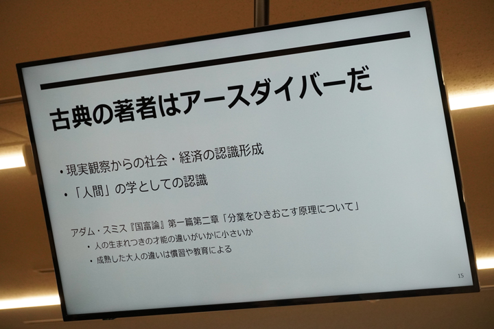 吉川先生は自身の研究スタイルを「書斎でアースダイブ」と名付け、地域に実際に出向くフィールドワークだけでなく、古典的な研究を読み込み、埋もれてしまったが実は活かせるアイデアを発掘する手法を紹介しました。フィールドワーク(現場)と古典研究(書斎)の両面からアースダイブの可能性を示し、現代社会に必要なのは、人間と社会を深く掴み直す「人間学」としての経済学であるというメッセージを提示しました。理論中心や計量分析中心のアプローチだけでなく、地域に寄り添いながら調査研究を実施していくことを今後も意識して活動を展開していきたいと締めくくりました。