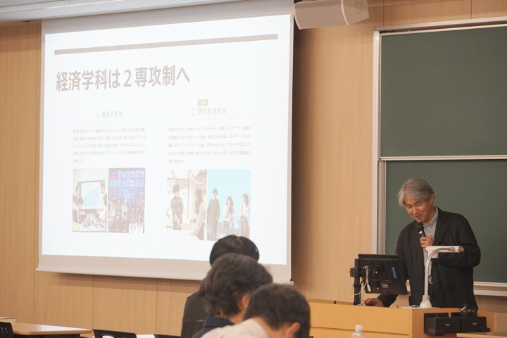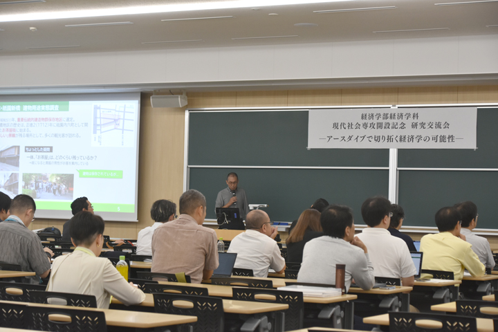 研究交流会冒頭、第1部では吉川英治教授から経済学部経済学科が2026年4月より2専攻制となること、現代社会専攻の特徴について講演が行われました。また、第2部では経済学部教員によるアースダイブ事例紹介、第3部では龍谷大学政策学部 只友景士教授から講評及び講演をいただきました。