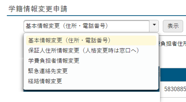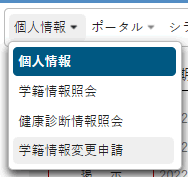 2. メニュー>個人情報>学籍情報変更申請を選択する。