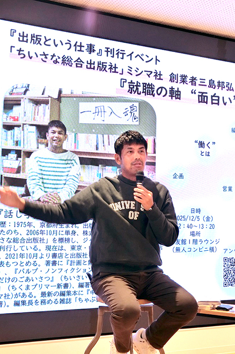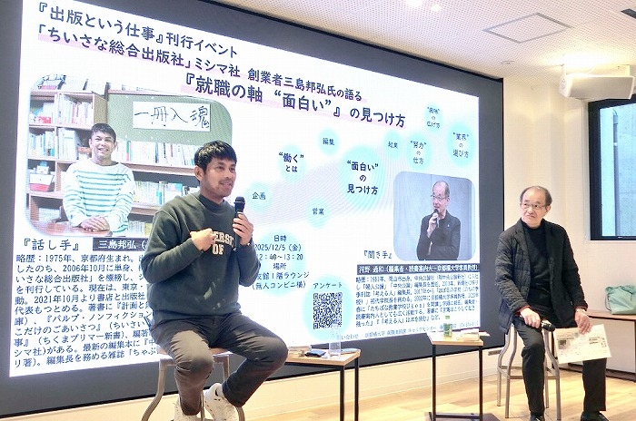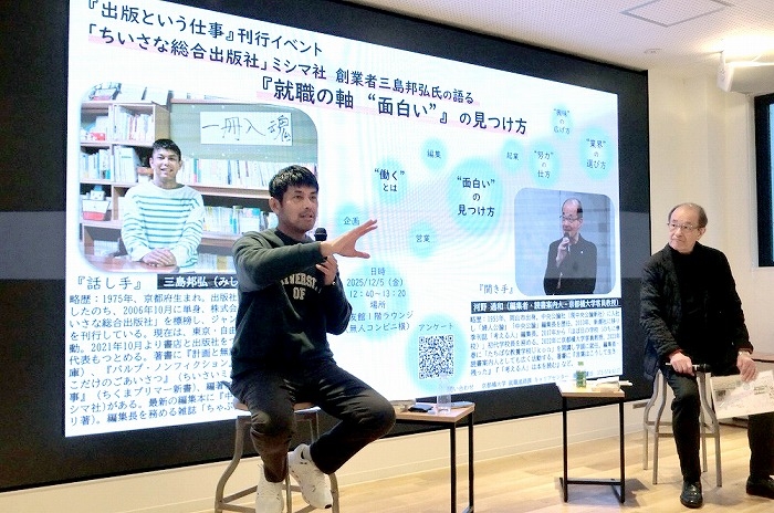 12月5日(金)、「ちいさな総合出版社」として知られるミシマ社の創業者・三島邦弘氏による特別トークショー「就職の軸"面白い"の見つけ方」を開催しました。 このイベントは、変化の激しい時代において、どのようにキャリアを切り拓いていくのかを考えるヒントを学生に届けたいと、キャリアセンターが企画したものです。 当日は、本学が運営する「たちばな教養学校 Ukon」の学頭であり、編集者・読書案内人の河野通和氏がナビゲーターとして登壇。三島氏との対話形式で進行しました。