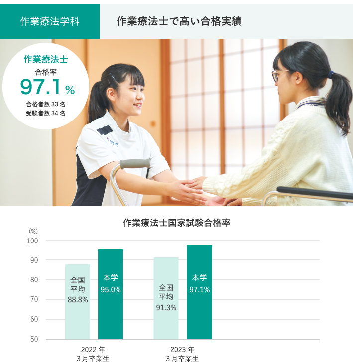 2025年3月の卒業生の国家試験合格率は、助産師、理学療法士、作業療法士、救急救命士で100%を達成し4冠を達成しました。