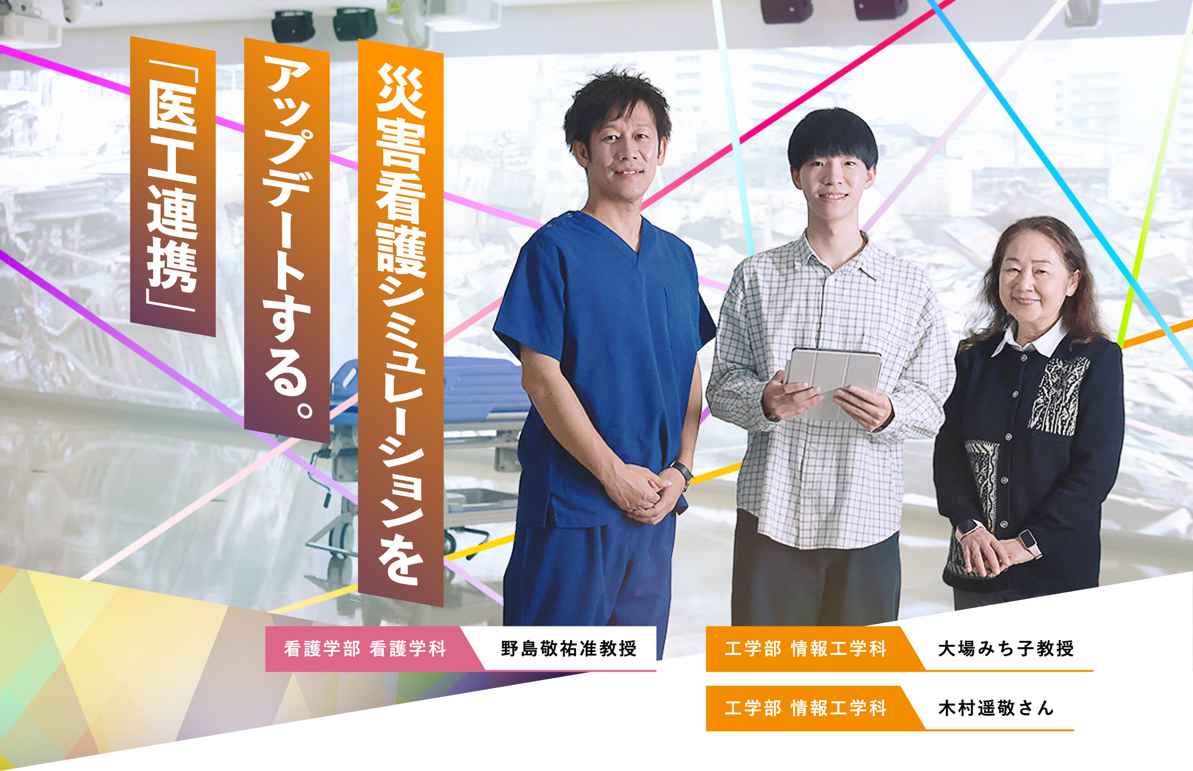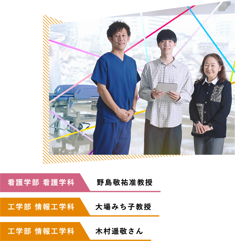 このプロジェクトに携わっている学生は、どんなことを感じながら卒業研究に取り組んでいたのだろうか。看護学部看護学科4回生の坊悠友さんは「近年、SNSなどで『AIの進化によって看護師の仕事がなくなるのでは』という意見を目にすることが増えました。しかし、本当にそうなのか?と疑問を感じ、このテーマを選びました」と語る。「多職種連携(※)の実習では、医療や福祉に関わるさまざまな専門職の学生と交流する機会がありました。医師、理学療法士、薬剤師など、異なる職種でも『人をケアする』という共通の考え方が根底にあります。今回の研究で、情報工学科の学生はシステムを通して社会や人を豊かにする専門家なのだと実感しました」と坊さんは振り返る。看護の現場で必要とされることを、情報工学の視点からシステムに落とし込む。その過程では、専門知識の違いによるギャップや、共通言語の不足を感じることもあったという。坊さんは、「自分が伝えたいことをシステムに反映させるには、これまでとは違ったコミュニケーションが必要。異なる世界の人たちと協力しながら、新しい看護の形を模索する経験でした。今回の研究で学んだことを活かし、デジタル技術にも精通した看護師になりたい」と、未来への意気込みを語った。これからの看護や介護の現場では、「他分野の知識や技術を活かす力」が求められる。河原先生は、「社会へ出たとき、目の前の状況を『当たり前』と考えず、『もっと良くできるはず』という視点を持つことが大切です。他の分野の専門家と協力し、新しい価値を生み出す力を培ってほしい」と学生たちへエールを送る。また、東野先生も「『楽しい』と思える社会でなければ、本当の意味でのウェルビーイング(Well-being)は実現できません。社会全体でデジタル技術をどう活用するか、若い人の力を活かしてもっと自由に議論するべきですね」と語る。京都橘大学では、学部の垣根を越えて学び合う環境が整っている。医療と工学、福祉とデジタル、それぞれ異なる専門性を持つ学生や教員が交流し、新しいアイデアを生み出していく。未来の医療を担うのは、こうした創造的な学びを重ねた若い力だ。技術と知識を融合し、新しい未来を創る。そんな学びがここにある。