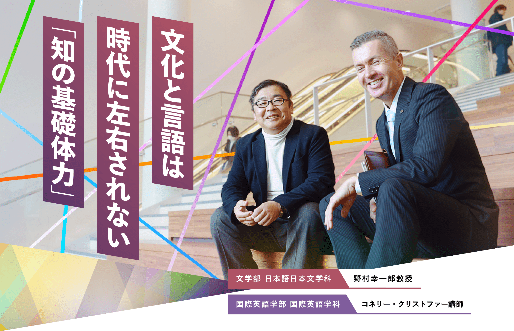 2025年4月、京都橘大学では新たに国際日本文化コースが開設される。日本のコンテンツが海外からどのように受け止められているかといった表象文化研究や、表現を通じた異文化理解によってグローバル教育の実現を目指す。物語研究を軸に日本文化の新たな価値を探求する文学部日本語日本文学科の野村幸一郎教授、国際英語学部国際英語学科で新カリキュラムの作成に携わり英語を楽しむ環境づくりに取り組むコネリー・クリストファー講師に、その展望を伺った。