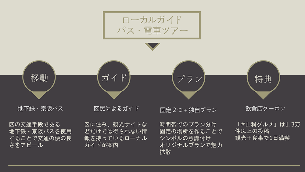 発表された提案は、区の代表的な観光スポット「毘沙門天」に焦点を当てたもの、若者を呼び込むためのe-スポーツイベントの開催やインスタ映えカフェの開設、交通安全の推進による安心のまちづくりなど、それぞれに特色のあるアイデアが登場。そのなかで区長賞に選ばれたのは、チーム『Twinkle』の「皆で創る山科ツアー」をコンセプトに、区民のガイドで行うローカルガイド バス・電車ツアーの提案でした。