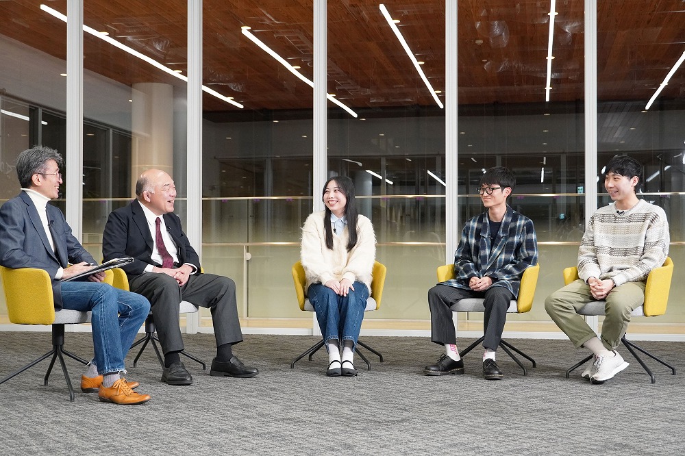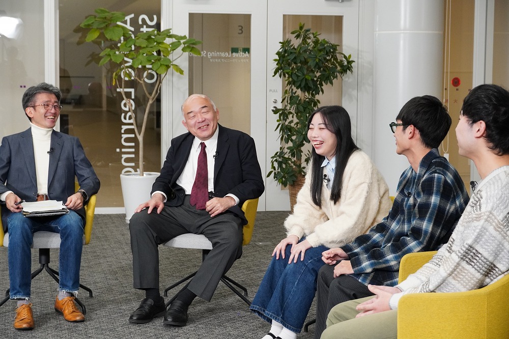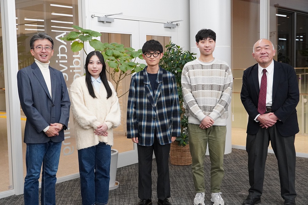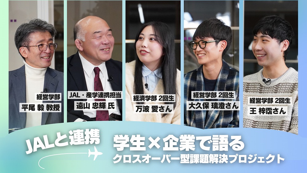 そこで、テーマとして「ツアープランニング(新たな人流)で地域課題を解決!」が提示されました。このテーマに取り組んだ3名の学生と、本プロジェクトを担当した経営学部の平尾毅教授、JALの遠山忠輝氏が再び集まり、プロジェクトの特徴や魅力、得られたものなどを振り返りました。