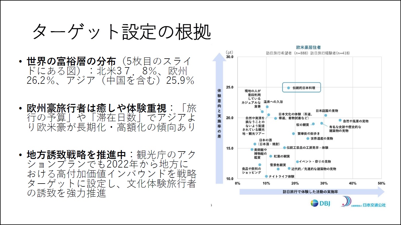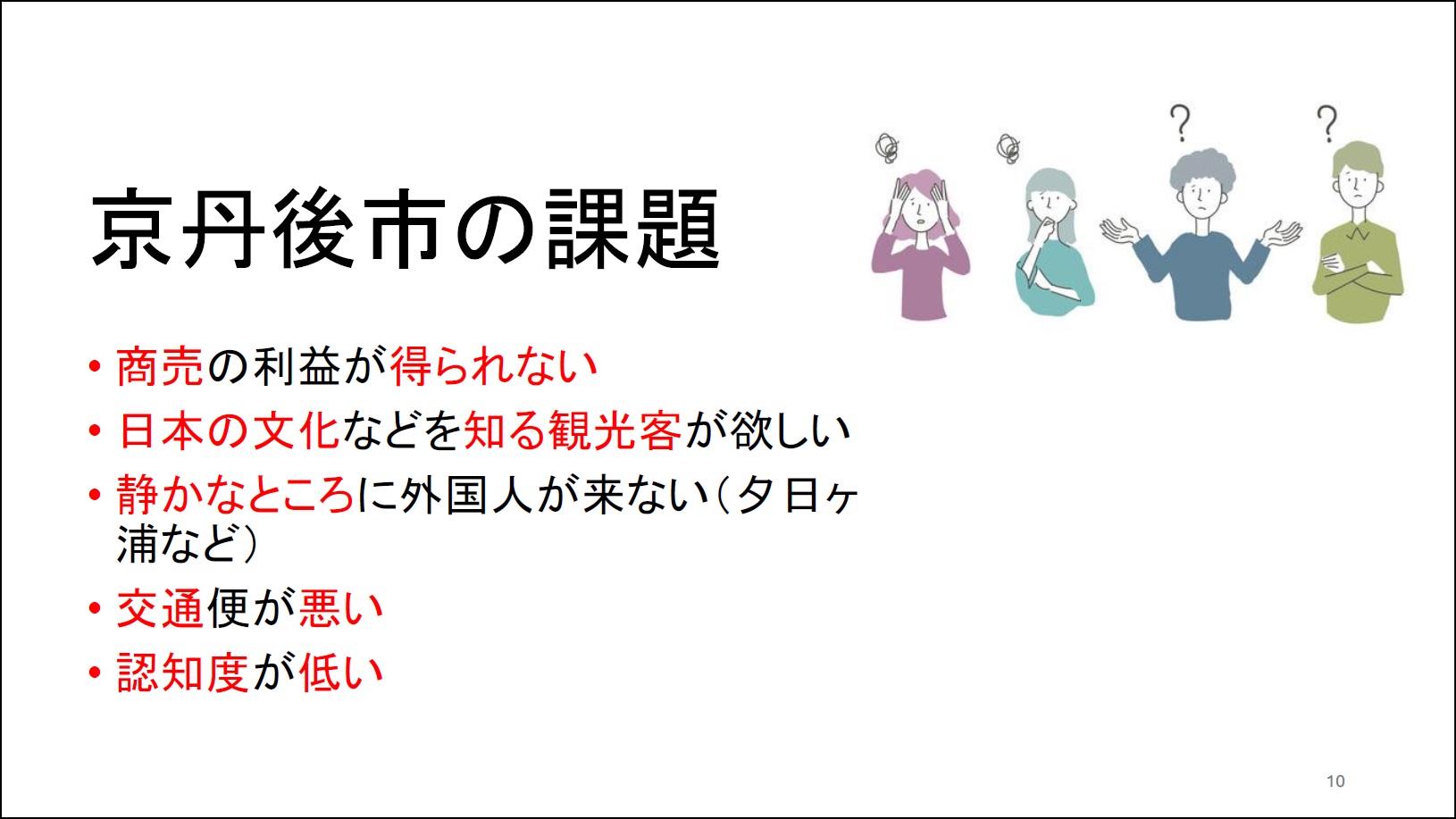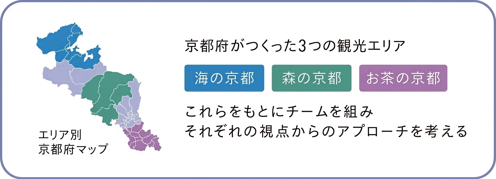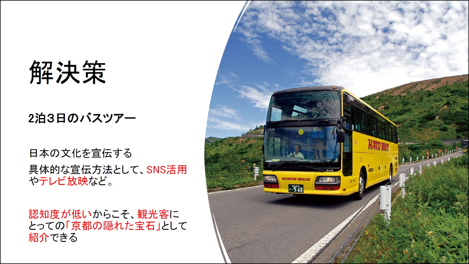 平尾/近年、京都市はオーバーツーリズム問題に直面しています。この問題を解決するには、京都市を訪れる観光客に広く府域を回遊してもらうことが重要です。今回皆さんは、京都府が掲げる「もうひとつの京都」構想と連動し、「海の京都」「森の京都」「お茶の京都」の3エリアに分かれていくつかのチームを組み、観光の分散化と同時に新しい人流を生み出すツアープランニングを提案しました。