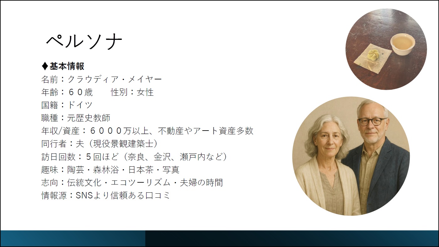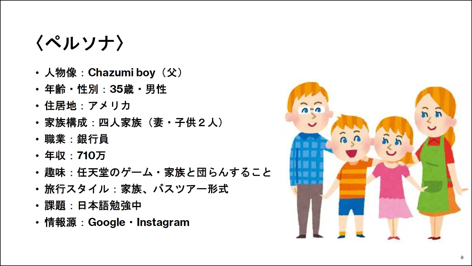 大久保/僕は、他の科目比べて実践的だと思いました。特に、自分が経営学部で学んだマーケティング手法の知識を活かして、「理論を実践する」ことができたのはこの授業の面白さだと感じました。例えば、ペルソナという架空の顧客像を設定することで、「この人物なら旅行の中でどんな体験を重視するだろう」と、ツアーの中身を深く掘り下げて提案につなげることができました。