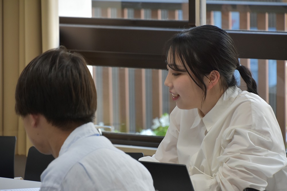 万波/私はグループワークを通して、コミュニケーション力や人前で発表する力はもちろんですが、特に一つの課題に対して粘り強く考える力が身につきました。