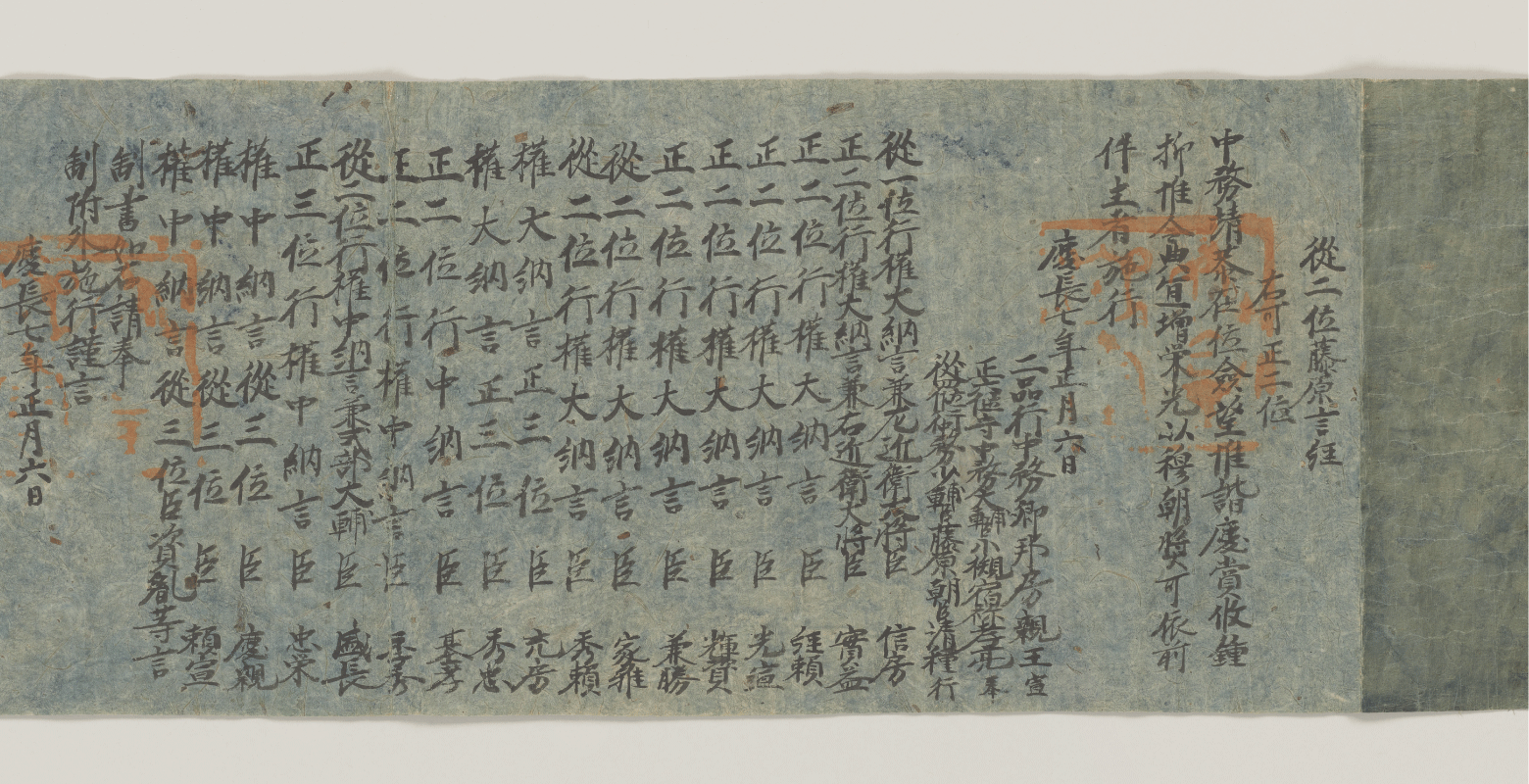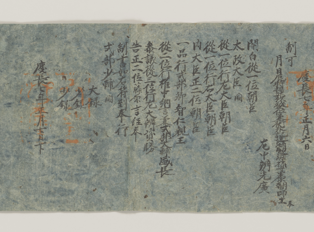 表紙(第一紙)に貼り付けられている紙紐や黄褐色の軸木は故実に則った仕様になっており、中世後期の位記の形態・特徴をそなえたものと評価してよいでしょう。