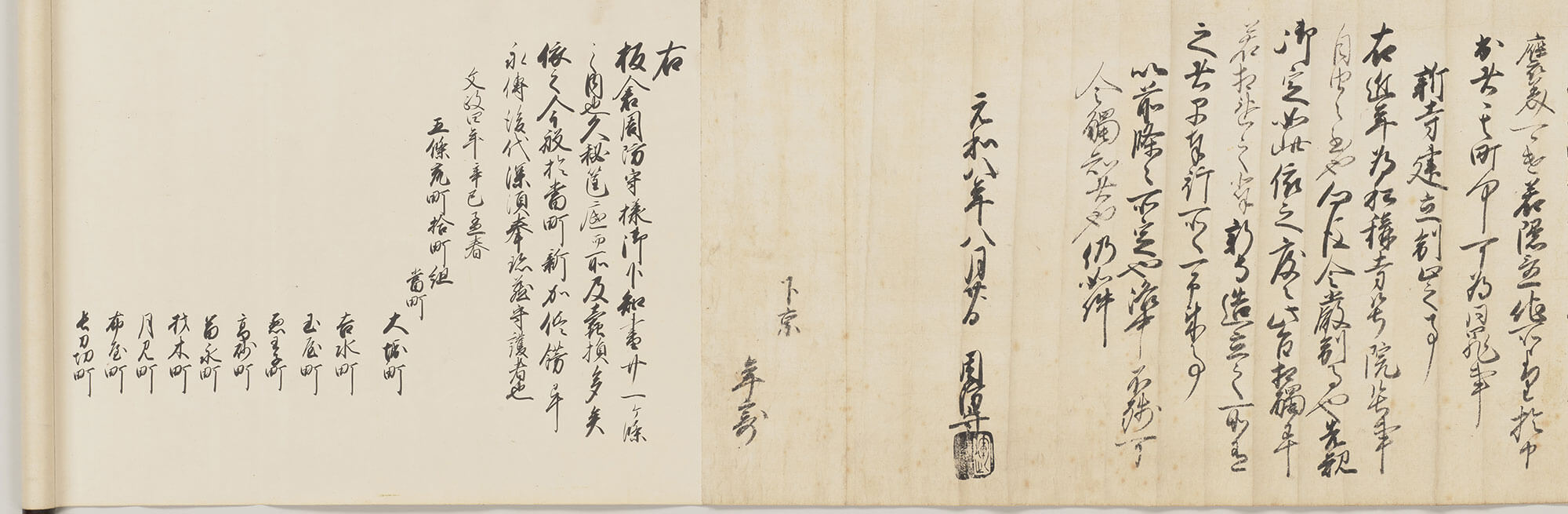 この文書1巻は、他の2巻とセットで下京の中の町組(各町が集まって形成された組)の一つ、五条荒町拾町組(五条荒神組)で管理されていたらしく、そのことはこれら3巻に貼り継がれた文政4年(1821)の奥書から分かります。