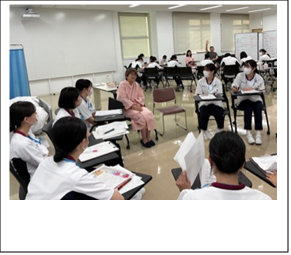 最後に、模擬患者さんも交えてのデブリーフィングを行いました。患者側からの率直な意見や思いをお聞きすることができ、患者の視点で看護することの大切さを改めて実感した演習となりました。参加した学生の皆さん、模擬患者の皆様、ありがとうございました。