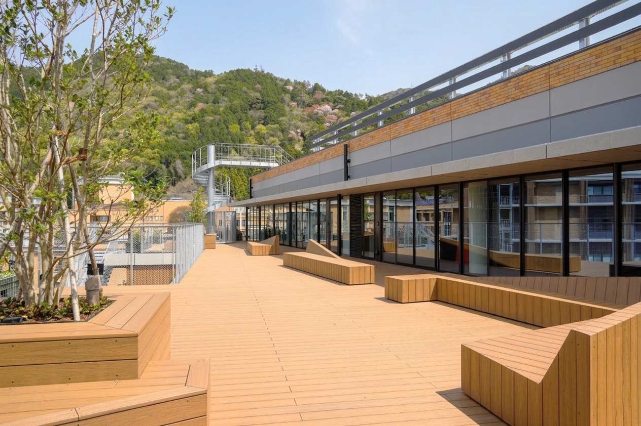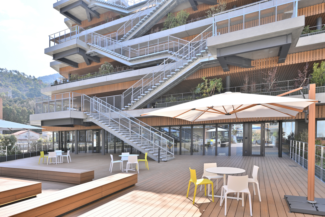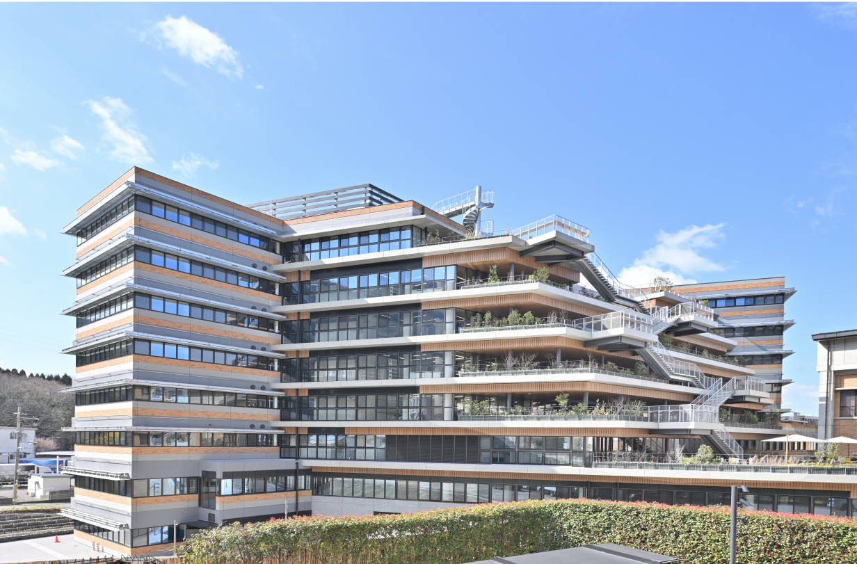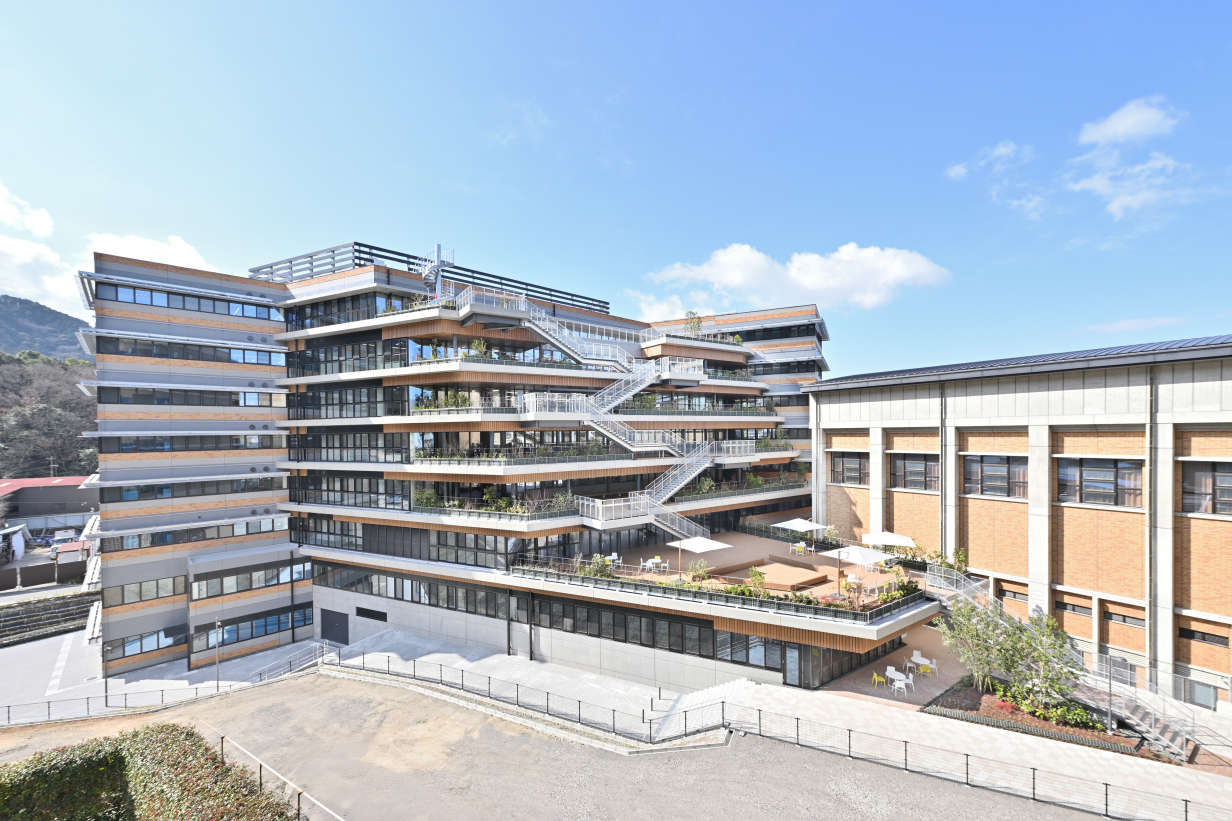新棟「アカデミックテラス」は自然と調和し、多様な交流を生み出す、情報・AI・医療のオープンイノベーション拠点です。医療と工学の最先端を学ぶ教育・研究設備を擁するとともに、地面から最上階まで屋外階段とテラスが続く外観が特徴です。
