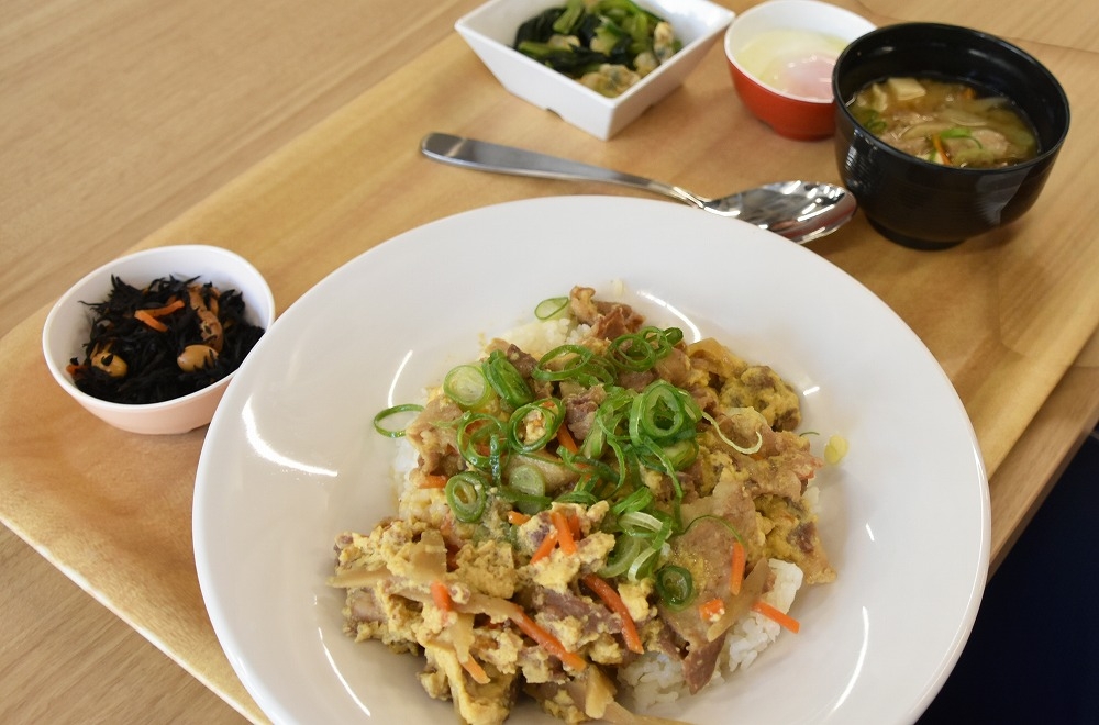 持久⼒向上にはグリコーゲン(糖質)を筋⾁と肝臓に蓄えることが重要。⾼炭⽔化物を意識したメニューとなっています。糖質を効率よくエネルギーに変換するために『糖質+ビタミンB1』(⾷材︓豚⾁、⼤⾖製品)を、また、⼤量に汗をかき、⾜裏の衝撃で⾚⾎球が破壊されるため、『鉄分+ビタミンC』(⾷材︓ひじき、⼩松菜、あさり)を摂取できる構成としています。