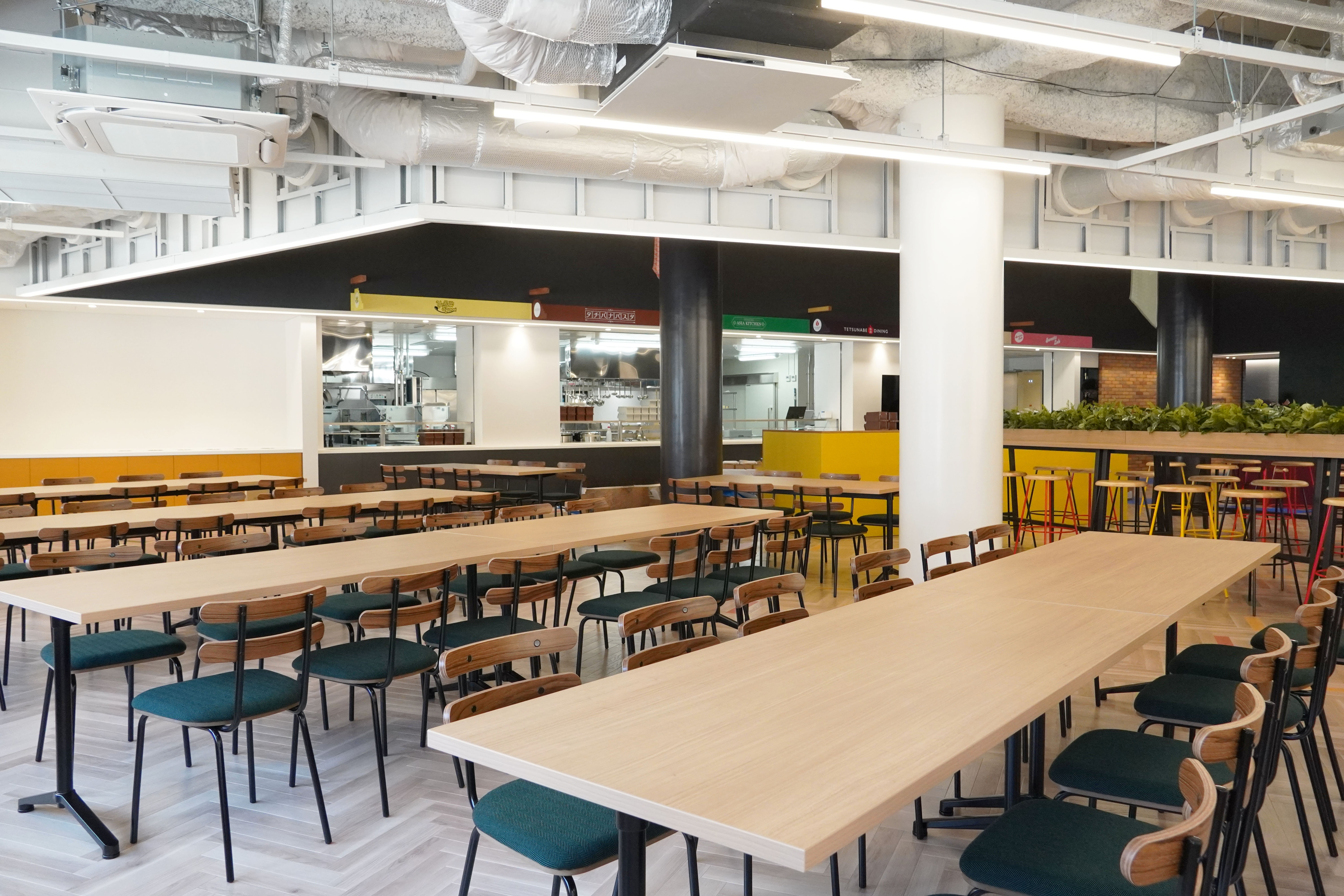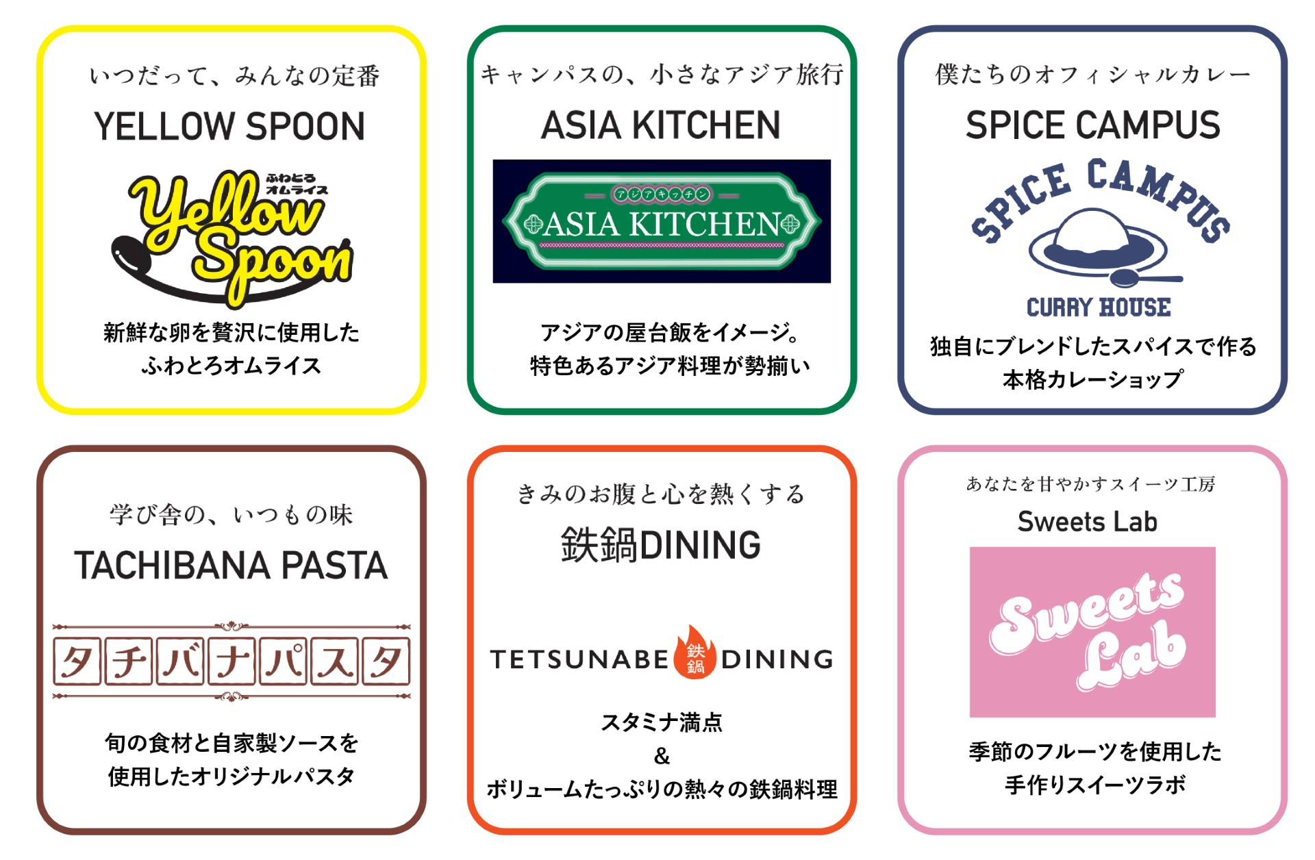 テラスダイニングコモンズは、6つの業態を展開するフードコートスタイルの学⽣⾷堂として幅広いメニューを提供するほか、課外活動団体各クラブからの要望に応じて、競技ごとのメニュー開発や、⾝体づくりに適した⾷事を提供します。競技特性に応じたエネルギー設計や栄養バランスの⼯夫など、個別の相談内容に応じた⾷事提供を通じて、本学クラブに所属する選⼿のパフォーマンス向上と健康維持を⽀援します。