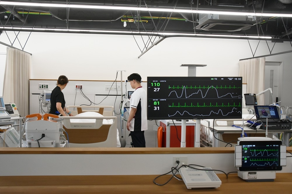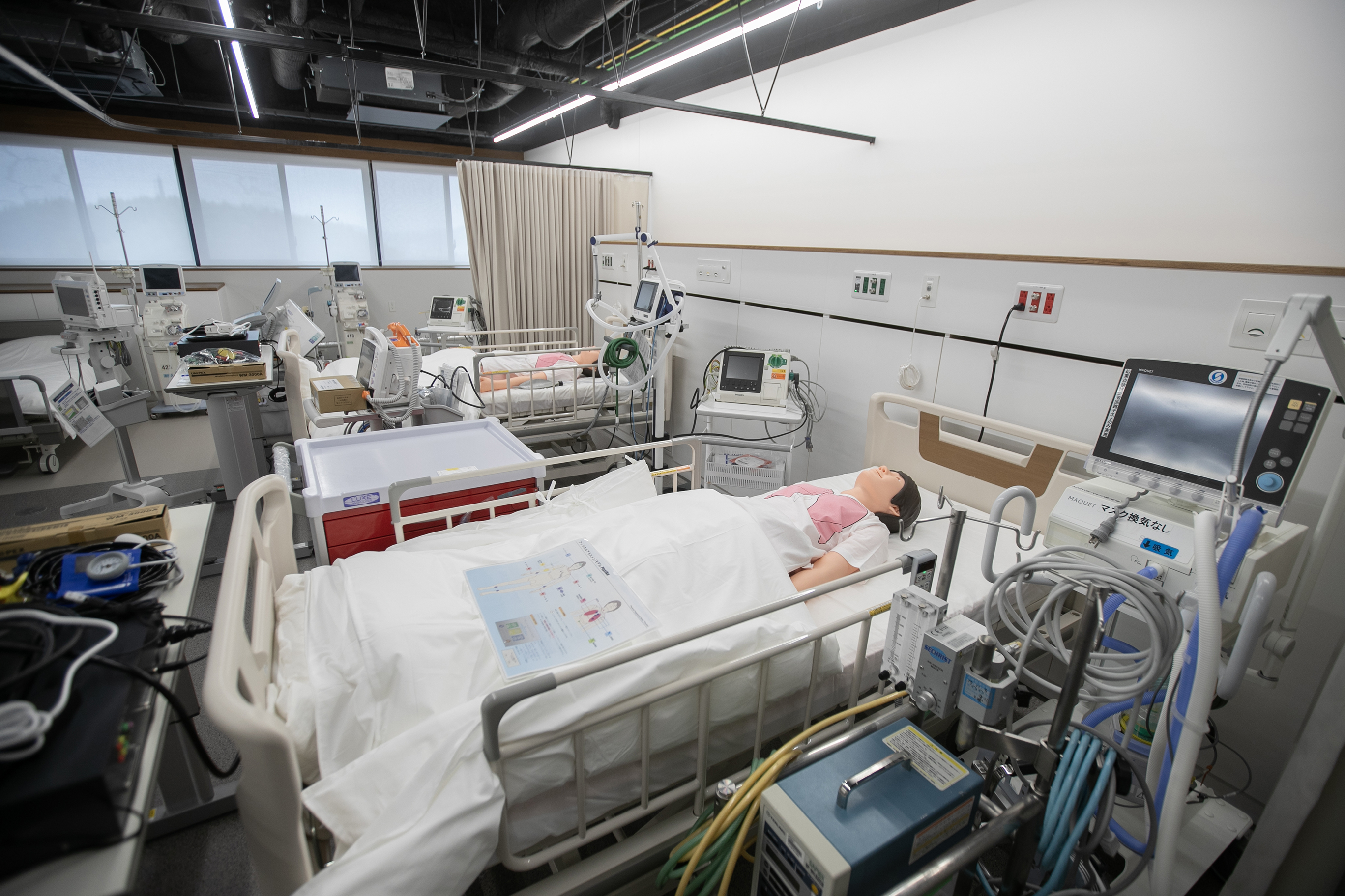 透析ベッド4床、ICUベッド2床を配置し、集中治療室(ICU)の環境を再現しています。集中治療室内における患者管理や⾎液浄化業務をはじめ、⽣命維持管理装置を中⼼とした⾼度医療機器の運⽤・管理を、実際の臨床現場を想定した環境で学びます。