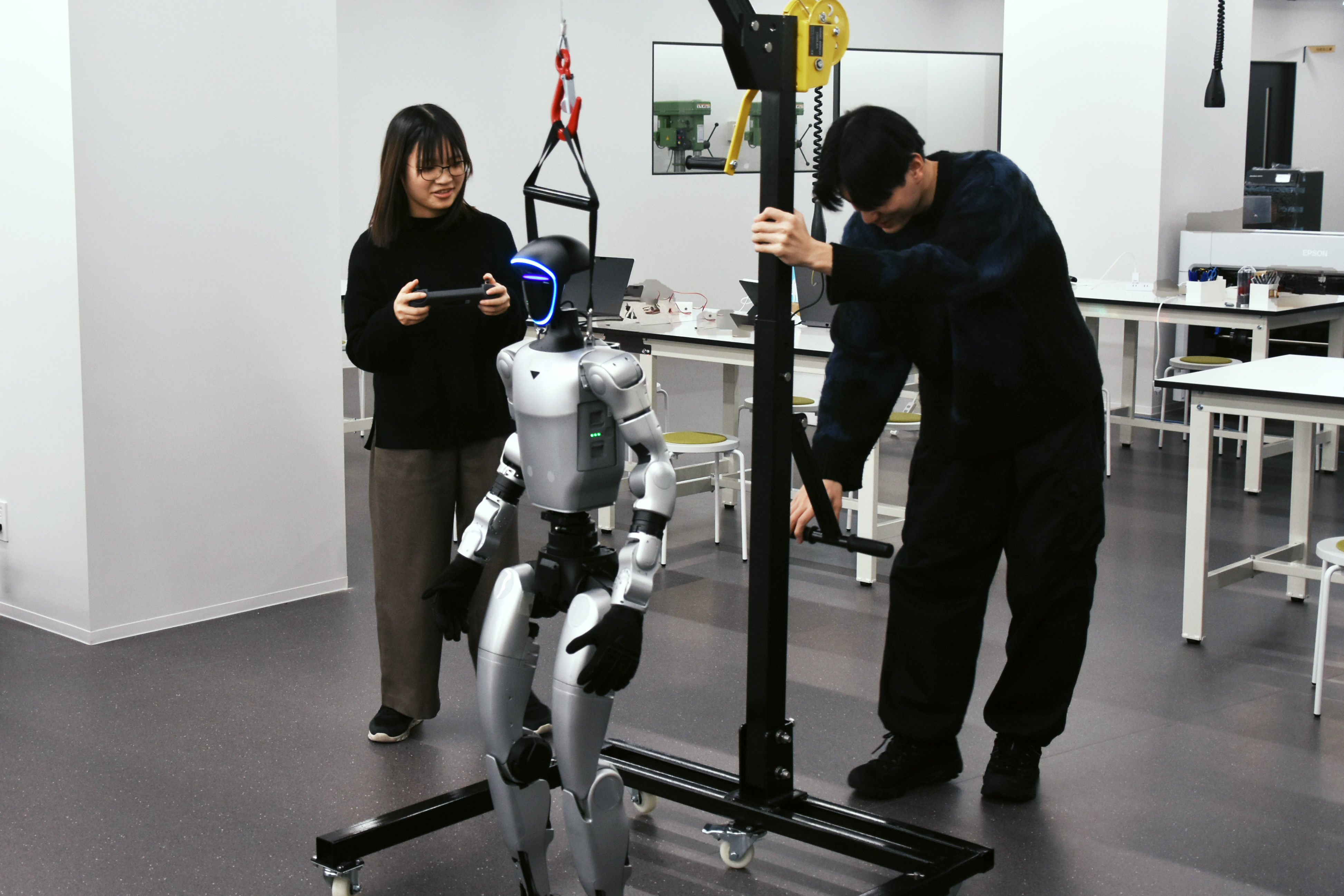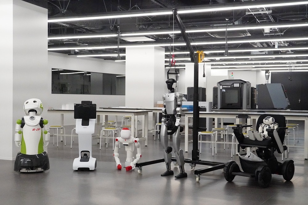 学部・学科を問わず全学⽣が利⽤可能。室内には、3Dプリンターやレーザーカッターなどの最新設備のほか、ボール盤やフライス盤といったものづくりの基本となる⼯作機械を整備しています。4⾜歩⾏ロボットや移動搬送ロボットも配置し、動作実験を⾏うためのスペースも完備しています