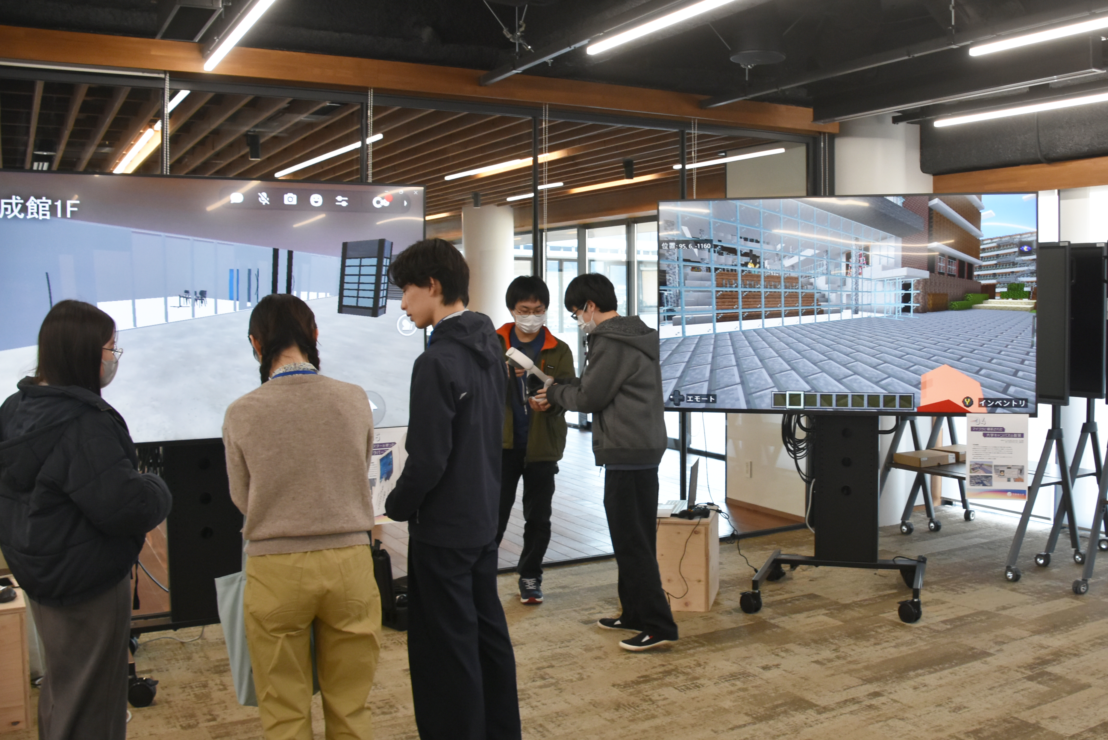 Media Lab3は、学⽣が⾃⾝の制作する映像やゲームはもちろん、最新のXR技術(VR/AR)やインタラクティブコンテンツを発表・展⽰等に活⽤する空間です。ゲームグラフィックや映像表現の魅⼒を余すことなく伝えるため、⼤型モニターを設置。スケール感のある作品展⽰に最適な環境を構築しています。
