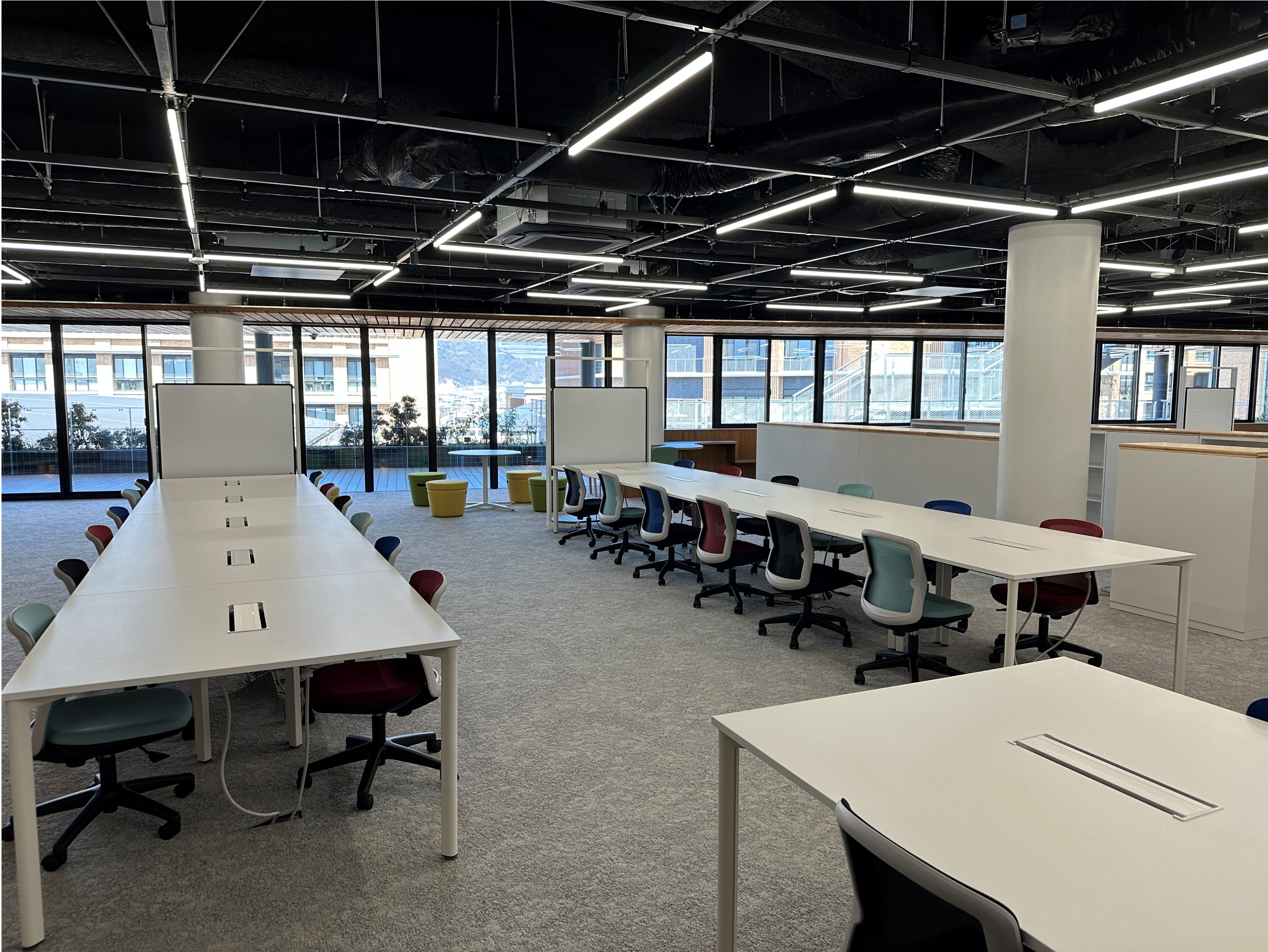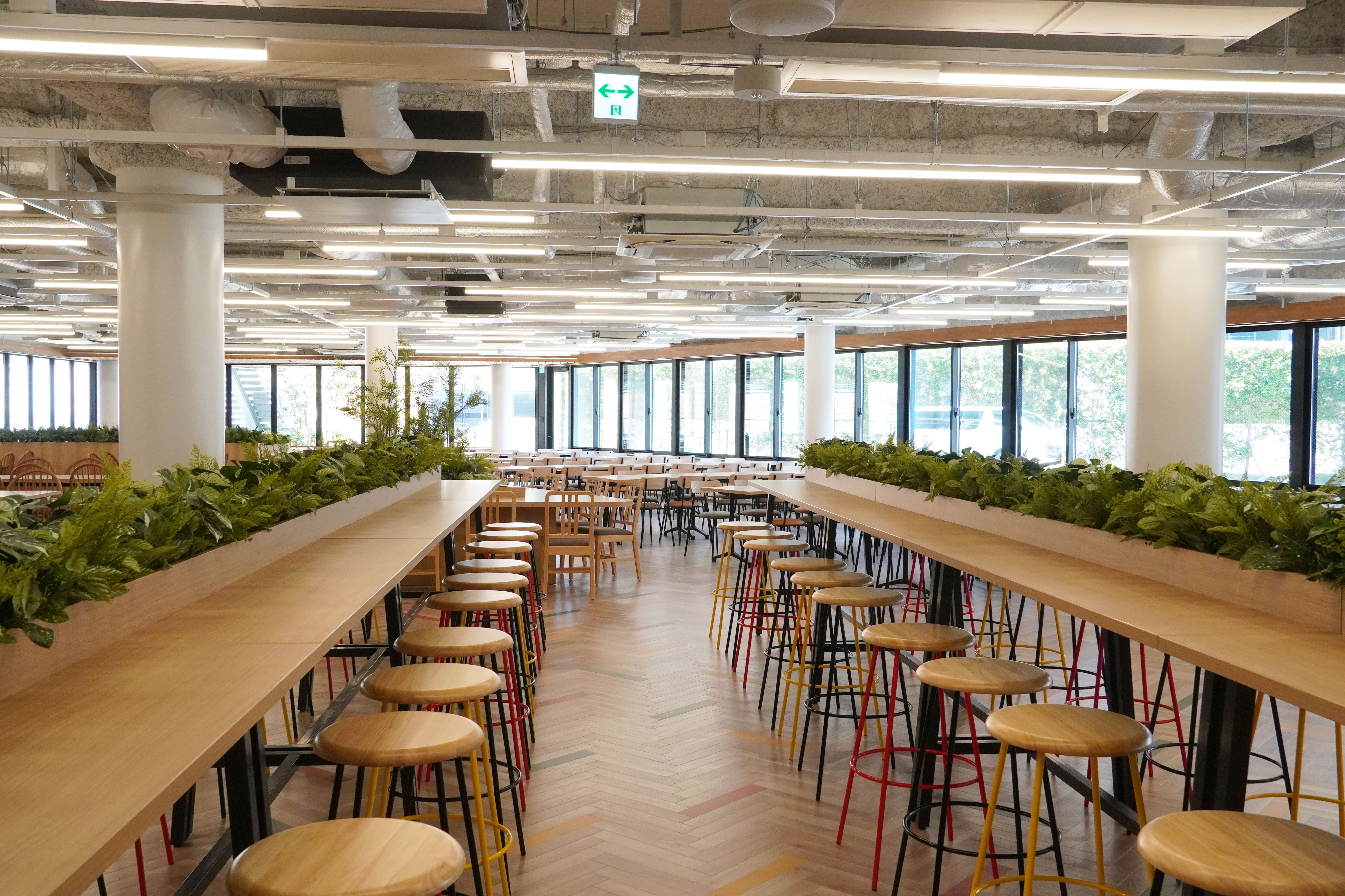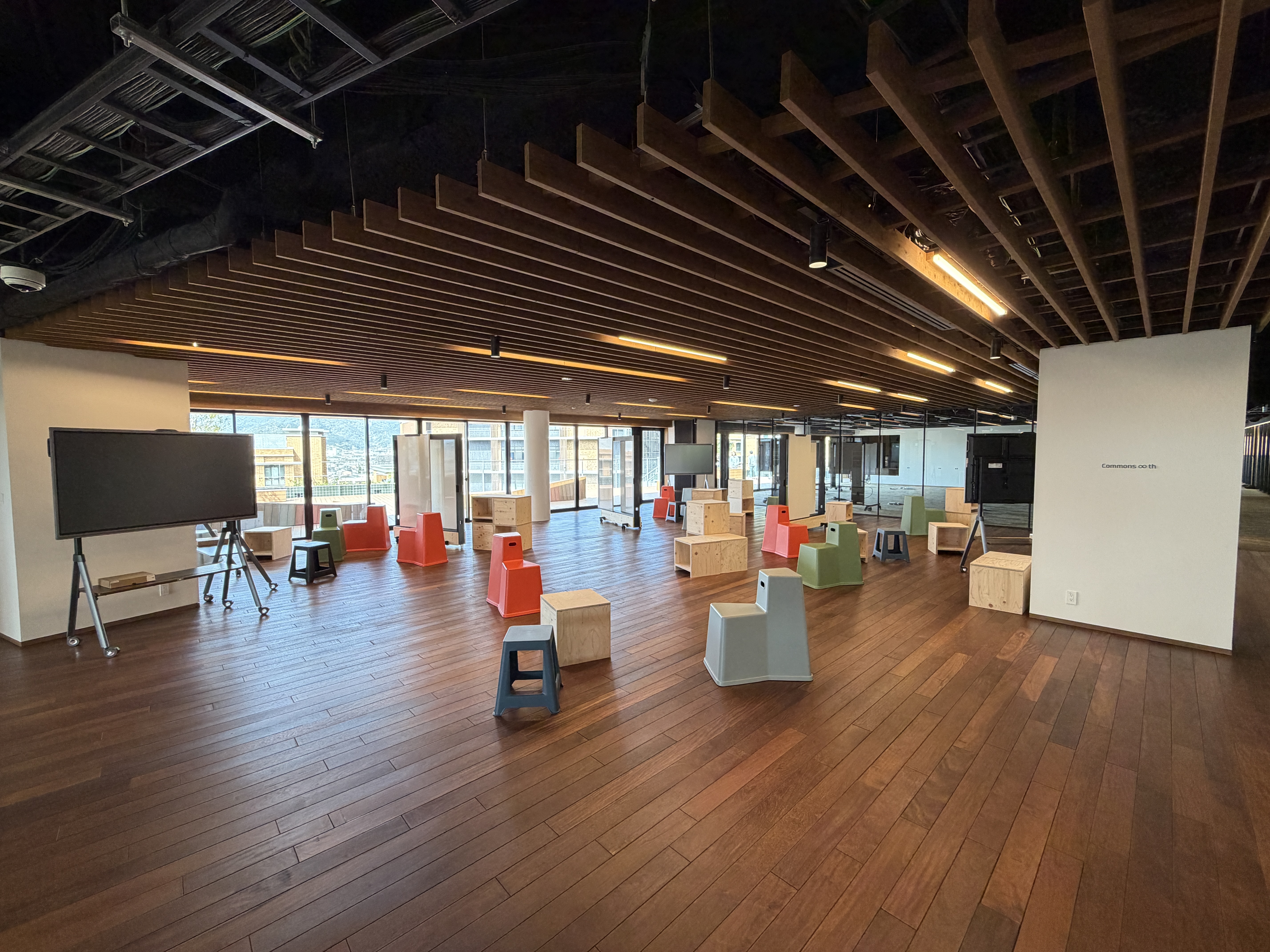 学⽣だけの閉ざされた空間ではなく、社会にも開かれた少し特別感のある場所として計画し、学内外の⼈が集まり、交流し、新しい価値を⽣み出す「未来価値創造の舞台」となることを⽬指しています。この空間には、移動しやすい椅⼦や家具を配置し、⽤途に応じて可変的な活⽤ができるよう⼯夫をしています。