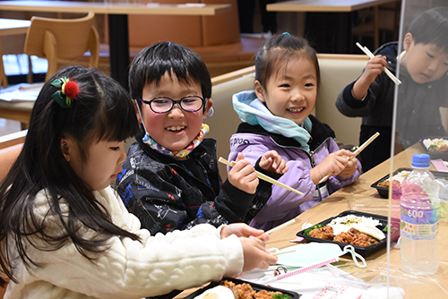 参加した保護者の方は、「京都橘大学の大学祭で以前実施されていた"ちびっこランド"に参加したことがあり、楽しかったことを覚えています。今日も家族みんなで仲良く楽しめ、とても良い時間になりました」「お弁当が200円ととても安く、ボリュームもあって良かったです。こういう機会はありがたいです」と話されました。