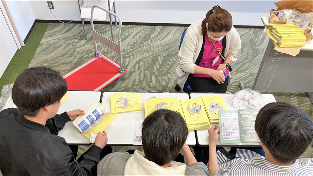 前日から看護学部の学生がパンフレットの準備のお手伝いをしてくれました。(内容を熟読しながら、「ホンマにこれ大事なことやんな。」と言いながら・・・。)