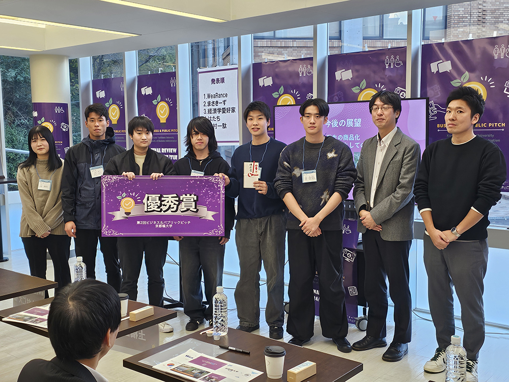 審査は松石経営学部長を審査員長とし、学外からは京都信用金庫、京都知恵産業創造の森からも審査員をお迎えして行われました。審査の結果、特別賞に3チーム、優秀賞に1チーム、最優秀賞に1チームがそれぞれ選出されました。
