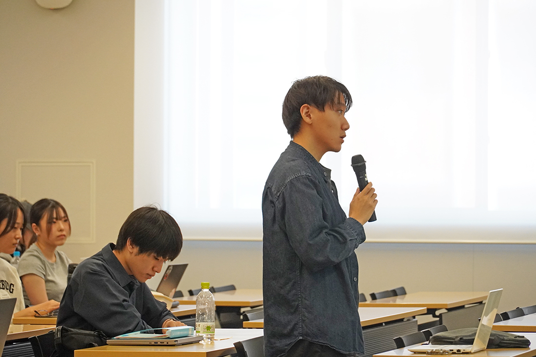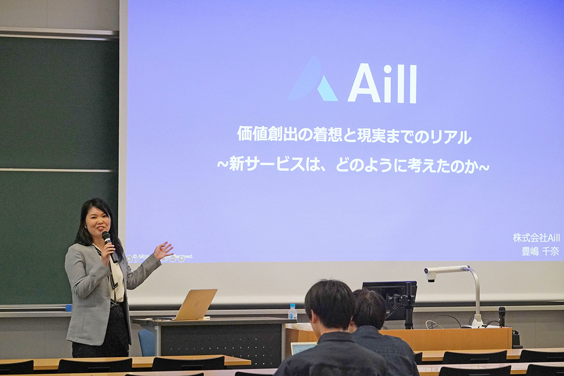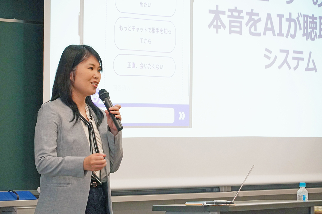 ほかにも、「個の幸せの集合体が日本活性化に繋がる」とし、「自分の人生に幸せを感じる」ことの実現をめざす企業ビジョンや、豊嶋氏のこれまでのキャリア、そして就職活動におけるポイント等について講義いただきました。講義終了後、質疑応答では受講学生から豊嶋氏へ授業時間内では収まらないほど多くの質問がされ、AIを駆使したサービスの開発、構築における企業戦略や、同社を立ち上げた豊嶋氏の思いを学ぶ機会となりました。