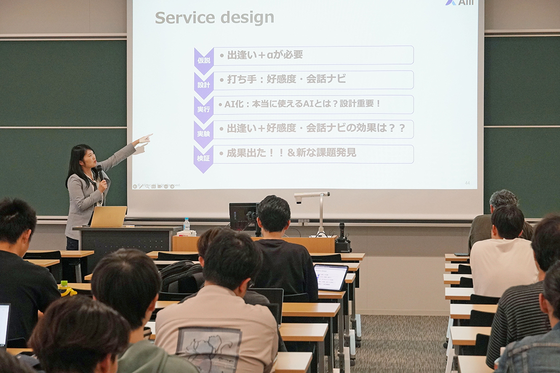 2025年10月6日(月)、松原仁教授が担当する「産業と情報通信技術」の講義において、株式会社Aill 代表取締役の豊嶋千奈氏をお招きし、講演会を開催しました。本科目では、AIやビッグデータ、IoT、ロボット、セキュリティなど最新の情報通信技術(ICT)を活用している民間企業や自治体、大学などの研究者や技術者を迎え、最新技術の動向や産業応用について講演いただくことで、ICTの実際の利活用の実例や技術を学ぶとともに、急速に進化するICTにより今後の産業や我々の生活がどう変化するのか、それによる社会的効果や課題が何なのかなどについて学びます。