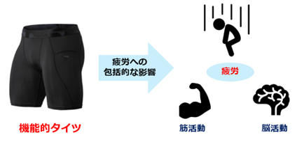 本研究では、機能的圧縮タイツが知覚される疲労と筋活動および脳波活動で測定される神経生理学的な疲労指標に及ぼす影響を検証しました。健常若年者を対象に、機能的タイツの有無による2条件を設定し、スクワット課題前後でスクワット姿勢保持中の筋活動および脳波活動を測定し、課題後に自覚的疲労感を評価し、機能的タイツの有無による各指標の違いおよび各指標間の相関関係を検証しました。その結果、機能的タイツ着用により自覚的疲労感の抑制および内側広筋の筋活動量抑制効果がみられました。脳波活動においても前頭部脳波活動の変動が少ない傾向がみられました。本研究の結果から機能的圧縮タイツ着用により、筋活動及び前頭部脳波活動が安定することにより、疲労を軽減できる効果が示唆されました。これらの知見は身体活動中の疲労の管理に貢献する可能性があります。