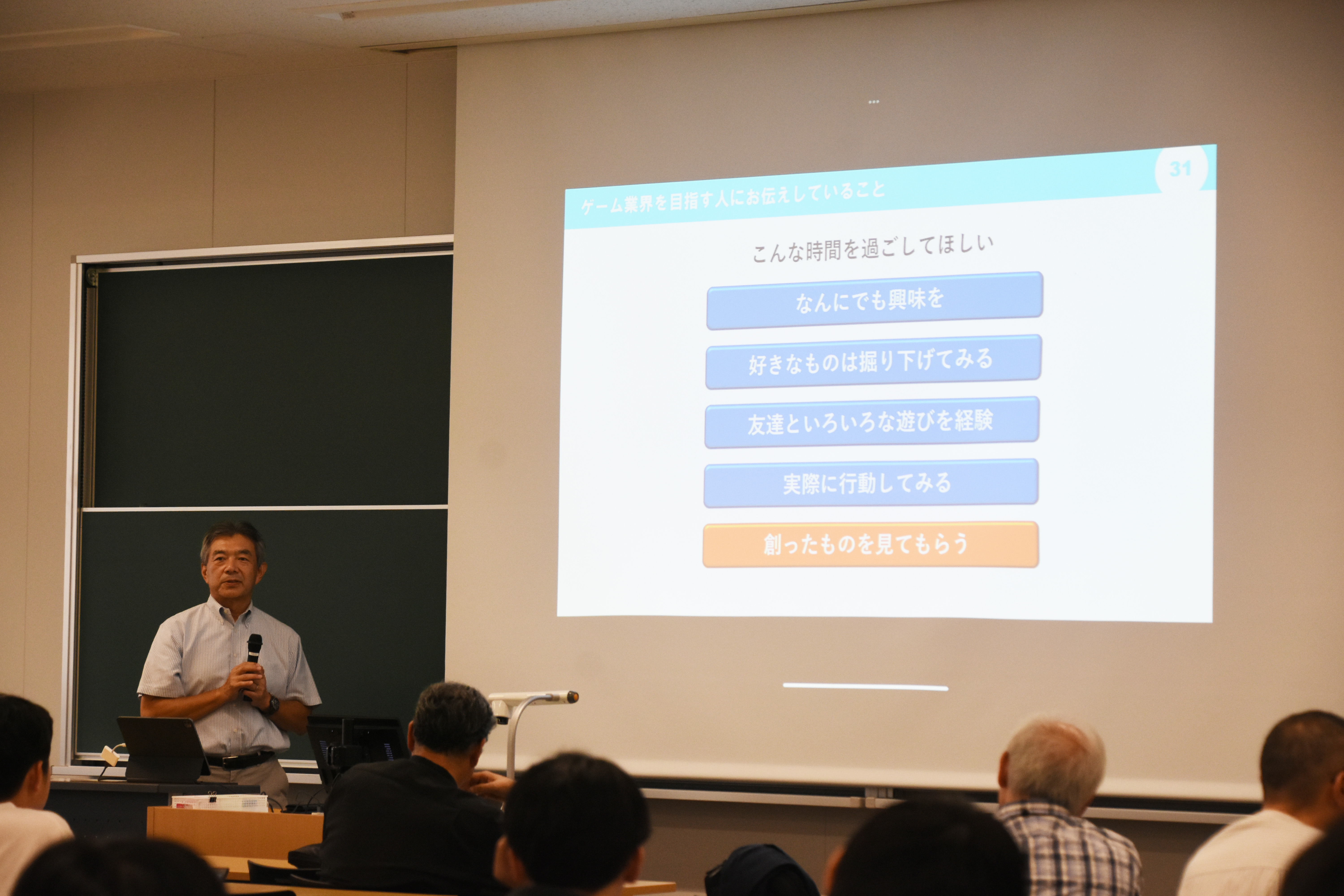 オンラインゲーム事業の立ち上げ期やグローバル展開の裏側など、実際のビジネス現場でのエピソードを交えながら、ゲーム業界が果たす社会的役割や今後の可能性について語られました。